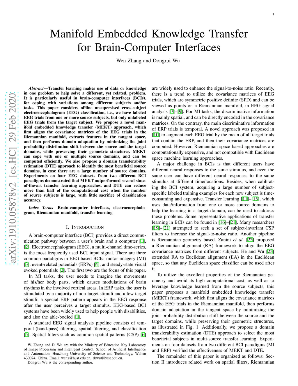 Manifold Embedded Knowledge Transfer for Brain-Computer Interfaces