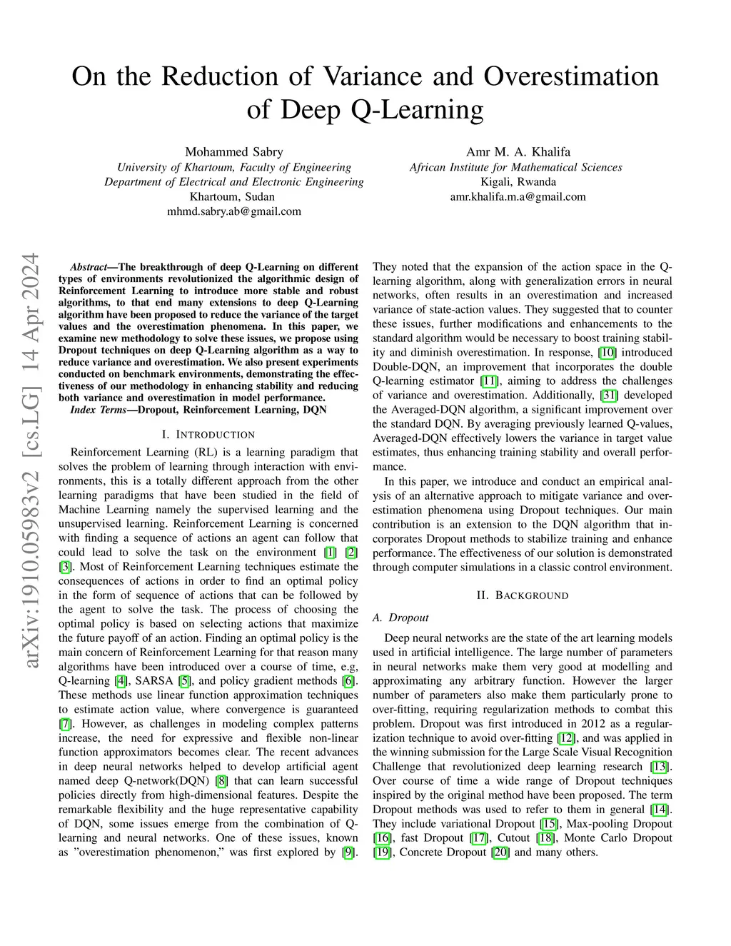 The breakthrough of deep Q-Learning on different types of environments revolutionized the algorithmic design of Reinforcement Learning to introduce more stable and robust algorithms, to that end many extensions to deep Q-Learning algorithm have been proposed to reduce the variance of the target values and the overestimation phenomena. In this paper, we examine new methodology to solve these issues, we propose using Dropout techniques on deep Q-Learning algorithm as a way to reduce variance and overestimation. We also present experiments conducted on benchmark environments, demonstrating the effectiveness of our methodology in enhancing stability and reducing both variance and overestimation in model performance.