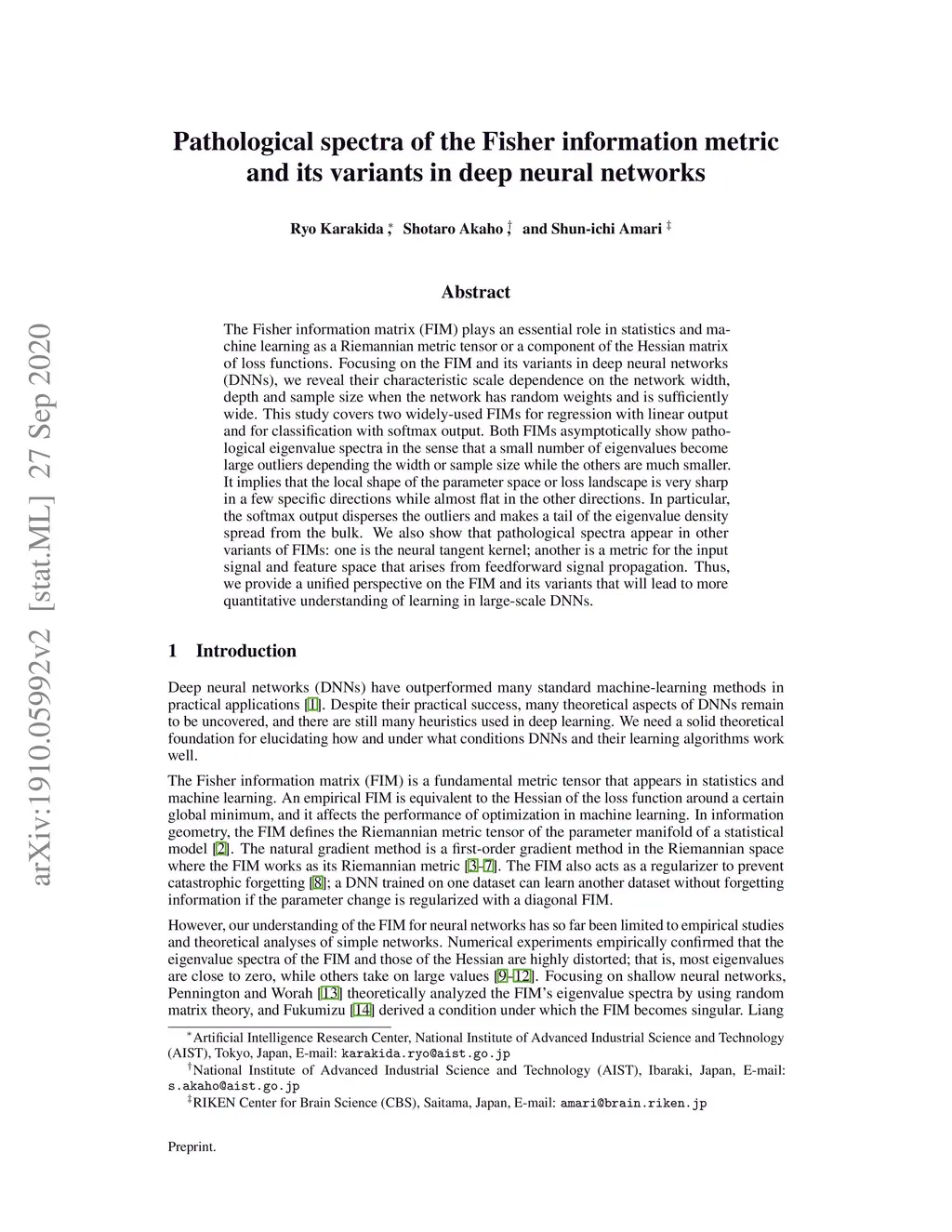 The Fisher information matrix (FIM) plays an essential role in statistics and machine learning as a Riemannian metric tensor or a component of the Hessian matrix of loss functions. Focusing on the FIM and its variants in deep neural networks (DNNs), we reveal their characteristic scale dependence on the network width, depth and sample size when the network has random weights and is sufficiently wide. This study covers two widely-used FIMs for regression with linear output and for classification with softmax output. Both FIMs asymptotically show pathological eigenvalue spectra in the sense that a small number of eigenvalues become large outliers depending the width or sample size while the others are much smaller. It implies that the local shape of the parameter space or loss landscape is very sharp in a few specific directions while almost flat in the other directions. In particular, the softmax output disperses the outliers and makes a tail of the eigenvalue density spread from the bulk. We also show that pathological spectra appear in other variants of FIMs: one is the neural tangent kernel; another is a metric for the input signal and feature space that arises from feedforward signal propagation. Thus, we provide a unified perspective on the FIM and its variants that will lead to more quantitative understanding of learning in large-scale DNNs.