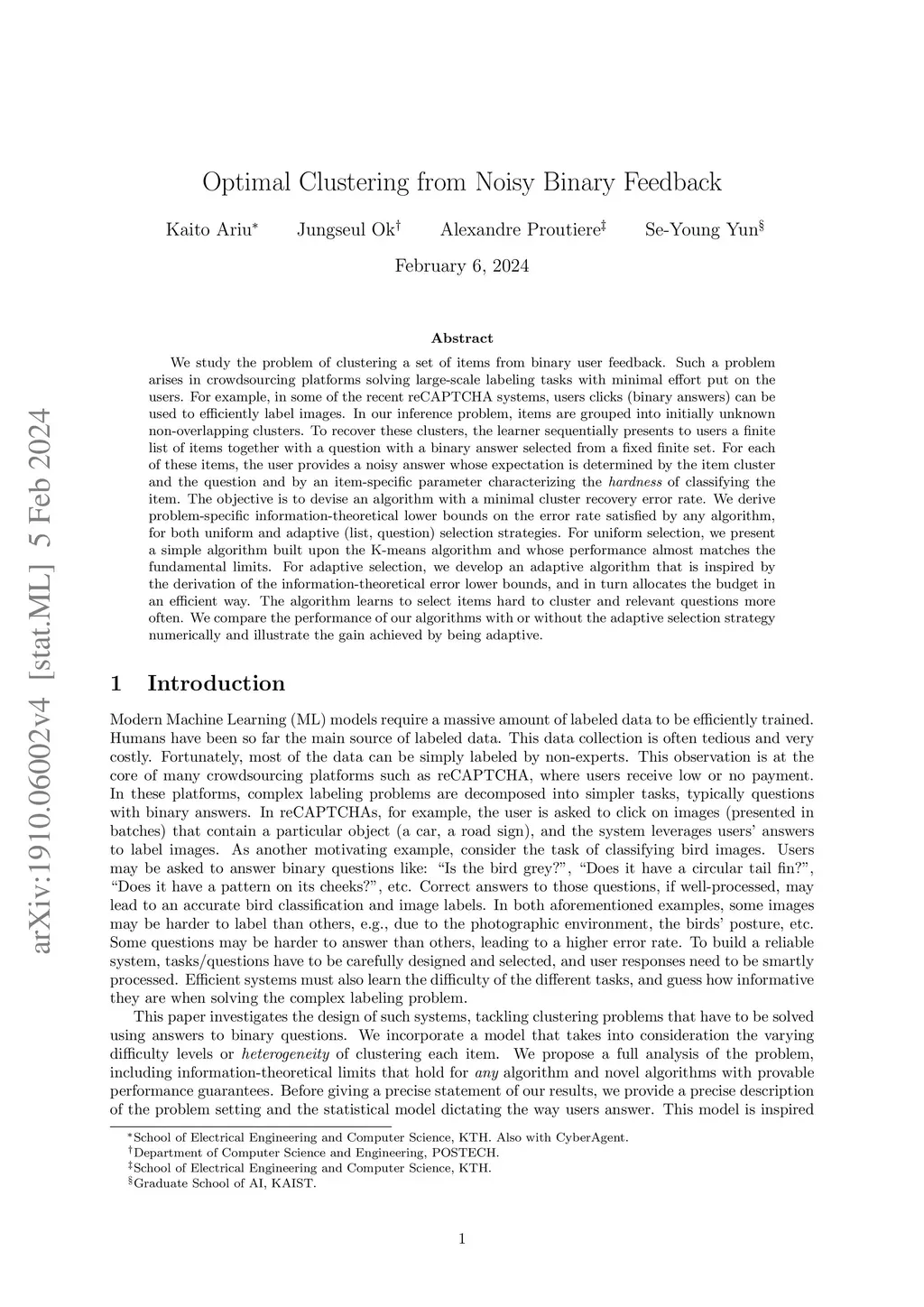 We study the problem of clustering a set of items from binary user feedback. Such a problem arises in crowdsourcing platforms solving large-scale labeling tasks with minimal effort put on the users. For example, in some of the recent reCAPTCHA systems, users clicks (binary answers) can be used to efficiently label images. In our inference problem, items are grouped into initially unknown non-overlapping clusters. To recover these clusters, the learner sequentially presents to users a finite list of items together with a question with a binary answer selected from a fixed finite set. For each of these items, the user provides a noisy answer whose expectation is determined by the item cluster and the question and by an item-specific parameter characterizing the {\it hardness} of classifying the item. The objective is to devise an algorithm with a minimal cluster recovery error rate. We derive problem-specific information-theoretical lower bounds on the error rate satisfied by any algorithm, for both uniform and adaptive (list, question) selection strategies. For uniform selection, we present a simple algorithm built upon the K-means algorithm and whose performance almost matches the fundamental limits. For adaptive selection, we develop an adaptive algorithm that is inspired by the derivation of the information-theoretical error lower bounds, and in turn allocates the budget in an efficient way. The algorithm learns to select items hard to cluster and relevant questions more often. We compare the performance of our algorithms with or without the adaptive selection strategy numerically and illustrate the gain achieved by being adaptive.