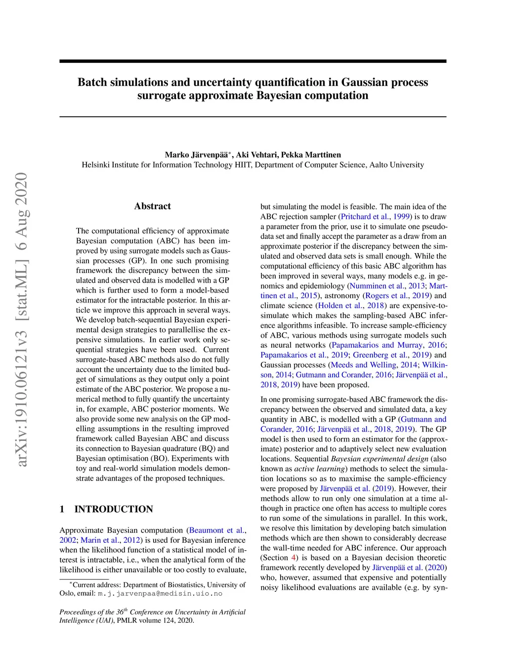 The computational efficiency of approximate Bayesian computation (ABC) has been improved by using surrogate models such as Gaussian processes (GP). In one such promising framework the discrepancy between the simulated and observed data is modelled with a GP which is further used to form a model-based estimator for the intractable posterior. In this article we improve this approach in several ways. We develop batch-sequential Bayesian experimental design strategies to parallellise the expensive simulations. In earlier work only sequential strategies have been used. Current surrogate-based ABC methods also do not fully account the uncertainty due to the limited budget of simulations as they output only a point estimate of the ABC posterior. We propose a numerical method to fully quantify the uncertainty in, for example, ABC posterior moments. We also provide some new analysis on the GP modelling assumptions in the resulting improved framework called Bayesian ABC and discuss its connection to Bayesian quadrature (BQ) and Bayesian optimisation (BO). Experiments with toy and real-world simulation models demonstrate advantages of the proposed techniques.