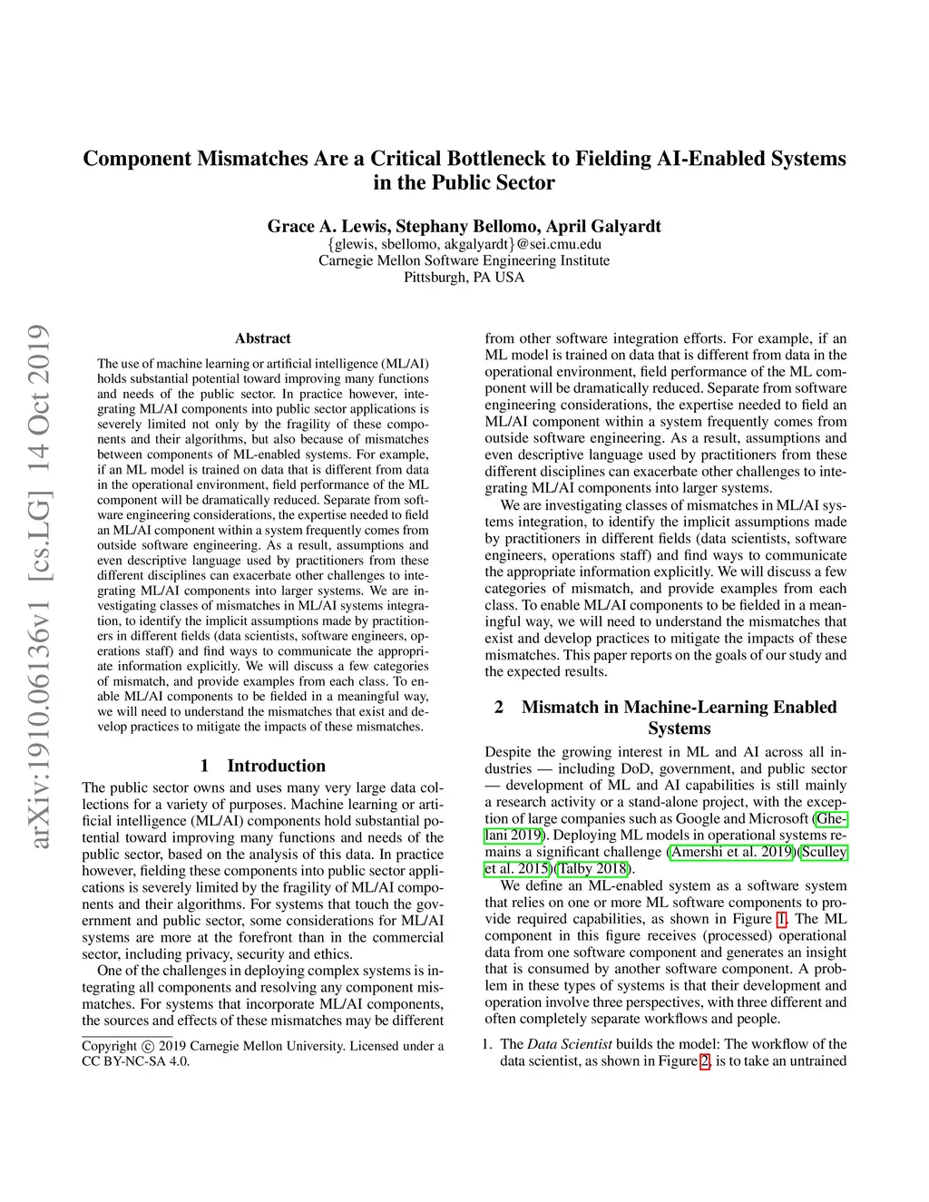 The use of machine learning or artificial intelligence (ML/AI) holds substantial potential toward improving many functions and needs of the public sector. In practice however, integrating ML/AI components into public sector applications is severely limited not only by the fragility of these components and their algorithms, but also because of mismatches between components of ML-enabled systems. For example, if an ML model is trained on data that is different from data in the operational environment, field performance of the ML component will be dramatically reduced. Separate from software engineering considerations, the expertise needed to field an ML/AI component within a system frequently comes from outside software engineering. As a result, assumptions and even descriptive language used by practitioners from these different disciplines can exacerbate other challenges to integrating ML/AI components into larger systems. We are investigating classes of mismatches in ML/AI systems integration, to identify the implicit assumptions made by practitioners in different fields (data scientists, software engineers, operations staff) and find ways to communicate the appropriate information explicitly. We will discuss a few categories of mismatch, and provide examples from each class. To enable ML/AI components to be fielded in a meaningful way, we will need to understand the mismatches that exist and develop practices to mitigate the impacts of these mismatches.