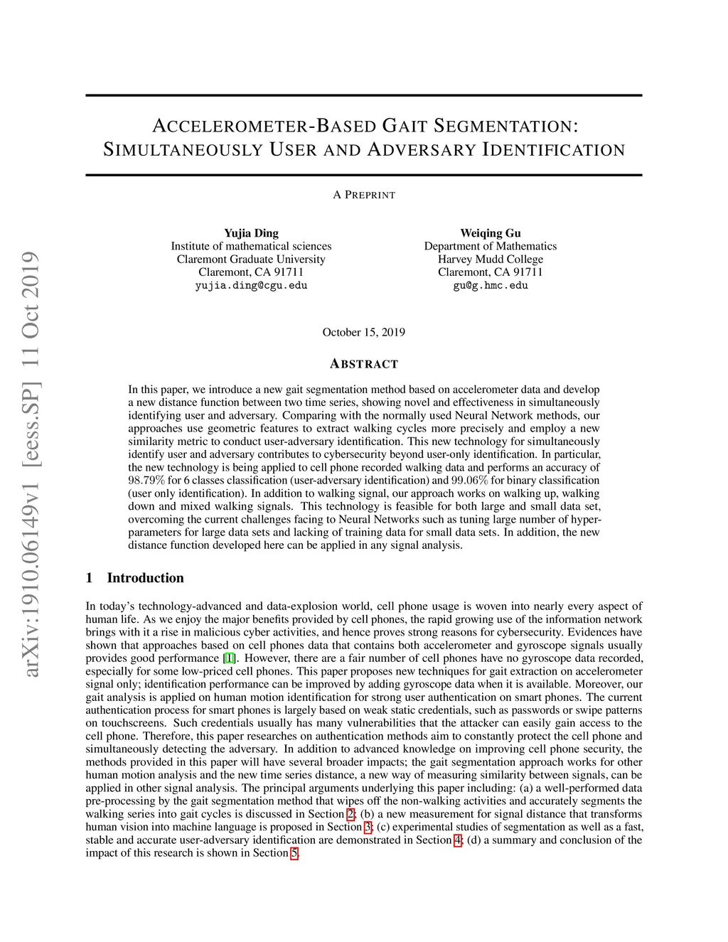 In this paper, we introduce a new gait segmentation method based on accelerometer data and develop a new distance function between two time series, showing novel and effectiveness in simultaneously identifying user and adversary. Comparing with the normally used Neural Network methods, our approaches use geometric features to extract walking cycles more precisely and employ a new similarity metric to conduct user-adversary identification. This new technology for simultaneously identify user and adversary contributes to cybersecurity beyond user-only identification. In particular, the new technology is being applied to cell phone recorded walking data and performs an accuracy of for 6 classes classification (user-adversary identification) and for binary classification (user only identification). In addition to walking signal, our approach works on walking up, walking down and mixed walking signals. This technology is feasible for both large and small data set, overcoming the current challenges facing to Neural Networks such as tuning large number of hyper-parameters for large data sets and lacking of training data for small data sets. In addition, the new distance function developed here can be applied in any signal analysis.