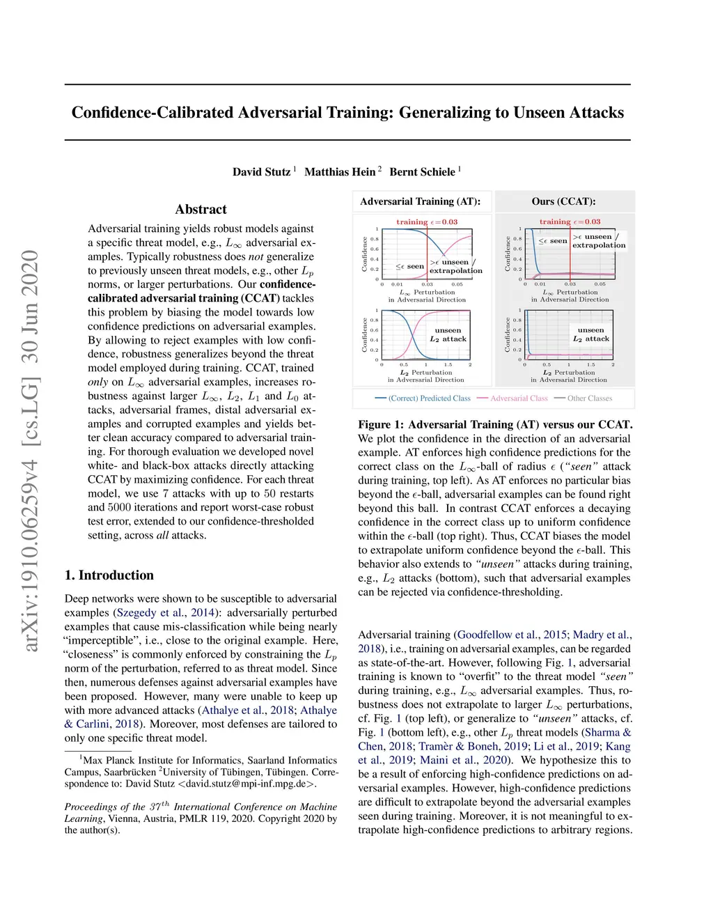 Adversarial training is the standard to train models robust against adversarial examples. However, especially for complex datasets, adversarial training incurs a significant loss in accuracy and is known to generalize poorly to stronger attacks, e.g., larger perturbations or other threat models. In this paper, we introduce confidence-calibrated adversarial training (CCAT) where the key idea is to enforce that the confidence on adversarial examples decays with their distance to the attacked examples. We show that CCAT preserves better the accuracy of normal training while robustness against adversarial examples is achieved via confidence thresholding, i.e., detecting adversarial examples based on their confidence. Most importantly, in strong contrast to adversarial training, the robustness of CCAT generalizes to larger perturbations and other threat models, not encountered during training. For evaluation, we extend the commonly used robust test error to our detection setting, present an adaptive attack with backtracking and allow the attacker to select, per test example, the worst-case adversarial example from multiple black- and white-box attacks. We present experimental results using , , and attacks on MNIST, SVHN and Cifar10.