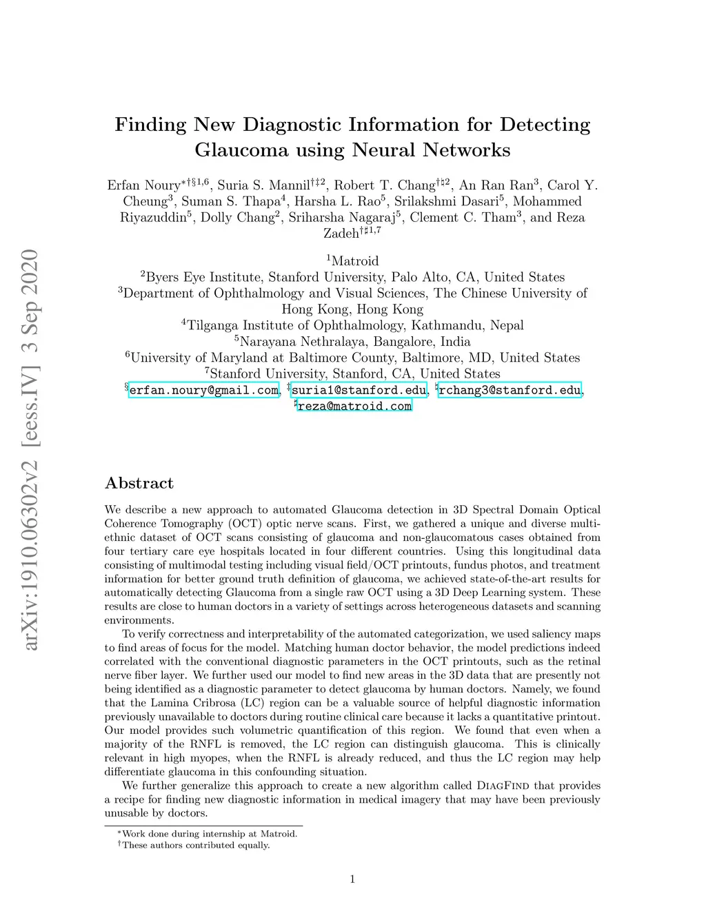 We describe a new approach to automated Glaucoma detection in 3D Spectral Domain Optical Coherence Tomography (OCT) optic nerve scans. First, we gathered a unique and diverse multi-ethnic dataset of OCT scans consisting of glaucoma and non-glaucomatous cases obtained from four tertiary care eye hospitals located in four different countries. Using this longitudinal data, we achieved state-of-the-art results for automatically detecting Glaucoma from a single raw OCT using a 3D Deep Learning system. These results are close to human doctors in a variety of settings across heterogeneous datasets and scanning environments. To verify correctness and interpretability of the automated categorization, we used saliency maps to find areas of focus for the model. Matching human doctor behavior, the model predictions indeed correlated with the conventional diagnostic parameters in the OCT printouts, such as the retinal nerve fiber layer. We further used our model to find new areas in the 3D data that are presently not being identified as a diagnostic parameter to detect glaucoma by human doctors. Namely, we found that the Lamina Cribrosa (LC) region can be a valuable source of helpful diagnostic information previously unavailable to doctors during routine clinical care because it lacks a quantitative printout. Our model provides such volumetric quantification of this region. We found that even when a majority of the RNFL is removed, the LC region can distinguish glaucoma. This is clinically relevant in high myopes, when the RNFL is already reduced, and thus the LC region may help differentiate glaucoma in this confounding situation. We further generalize this approach to create a new algorithm called DiagFind that provides a recipe for finding new diagnostic information in medical imagery that may have been previously unusable by doctors.