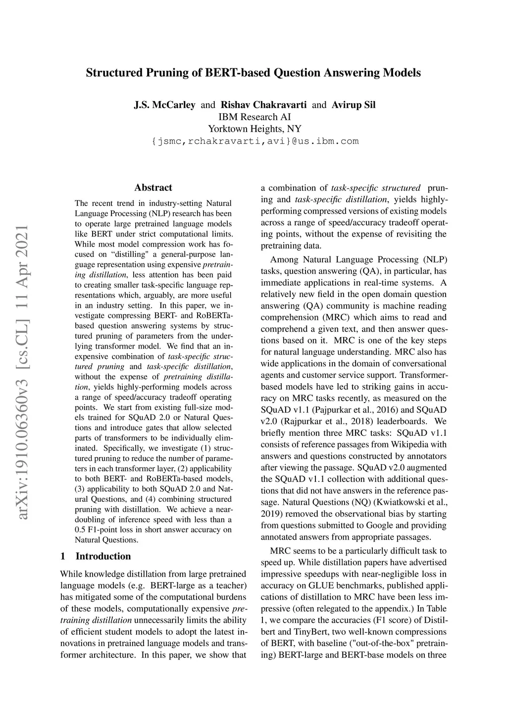 The recent trend in industry-setting Natural Language Processing (NLP) research has been to operate large %scale pretrained language models like BERT under strict computational limits. While most model compression work has focused on "distilling" a general-purpose language representation using expensive pretraining distillation, less attention has been paid to creating smaller task-specific language representations which, arguably, are more useful in an industry setting. In this paper, we investigate compressing BERT- and RoBERTa-based question answering systems by structured pruning of parameters from the underlying transformer model. We find that an inexpensive combination of task-specific structured pruning and task-specific distillation, without the expense of pretraining distillation, yields highly-performing models across a range of speed/accuracy tradeoff operating points. We start from existing full-size models trained for SQuAD 2.0 or Natural Questions and introduce gates that allow selected parts of transformers to be individually eliminated. Specifically, we investigate (1) structured pruning to reduce the number of parameters in each transformer layer, (2) applicability to both BERT- and RoBERTa-based models, (3) applicability to both SQuAD 2.0 and Natural Questions, and (4) combining structured pruning with distillation. We achieve a near-doubling of inference speed with less than a 0.5 F1-point loss in short answer accuracy on Natural Questions.