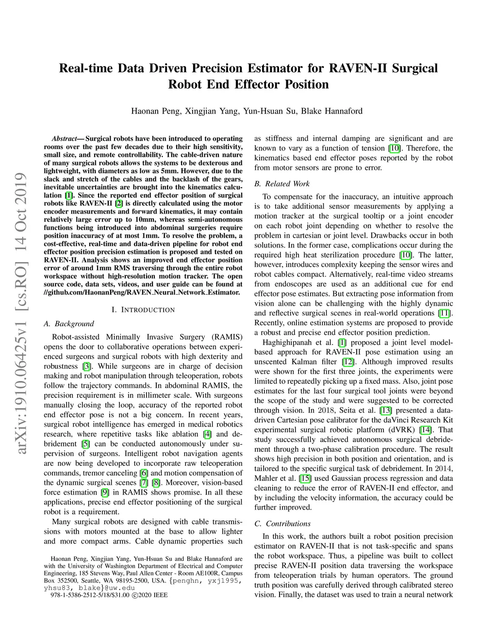 Real-time Data Driven Precision Estimator for RAVEN-II Surgical Robot