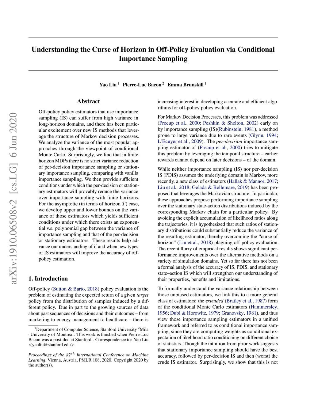 Off-policy policy estimators that use importance sampling (IS) can suffer from high variance in long-horizon domains, and there has been particular excitement over new IS methods that leverage the structure of Markov decision processes. We analyze the variance of the most popular approaches through the viewpoint of conditional Monte Carlo. Surprisingly, we find that in finite horizon MDPs there is no strict variance reduction of per-decision importance sampling or stationary importance sampling, comparing with vanilla importance sampling. We then provide sufficient conditions under which the per-decision or stationary estimators will provably reduce the variance over importance sampling with finite horizons. For the asymptotic (in terms of horizon ) case, we develop upper and lower bounds on the variance of those estimators which yields sufficient conditions under which there exists an exponential v.s. polynomial gap between the variance of importance sampling and that of the per-decision or stationary estimators. These results help advance our understanding of if and when new types of IS estimators will improve the accuracy of off-policy estimation.