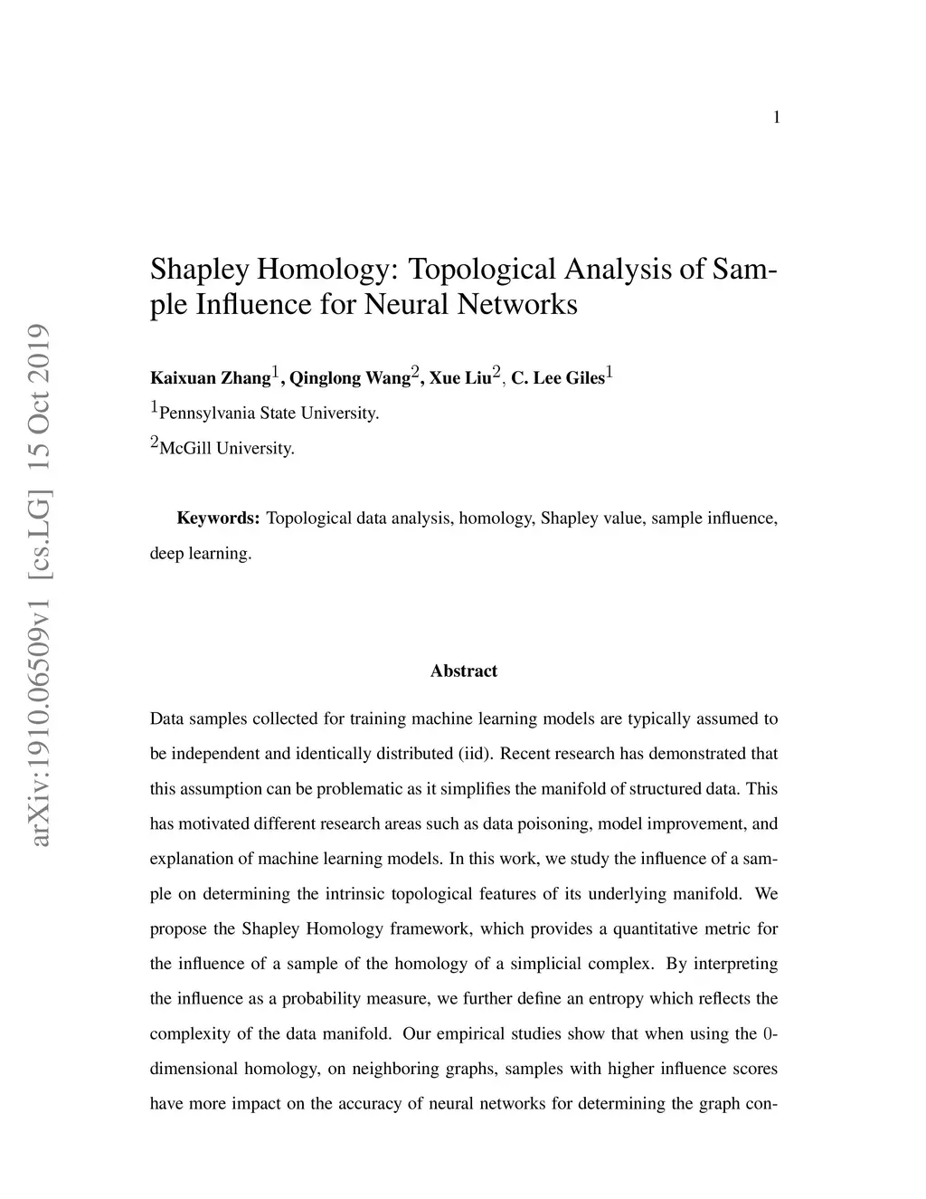 Data samples collected for training machine learning models are typically assumed to be independent and identically distributed (iid). Recent research has demonstrated that this assumption can be problematic as it simplifies the manifold of structured data. This has motivated different research areas such as data poisoning, model improvement, and explanation of machine learning models. In this work, we study the influence of a sample on determining the intrinsic topological features of its underlying manifold. We propose the Shapley Homology framework, which provides a quantitative metric for the influence of a sample of the homology of a simplicial complex. By interpreting the influence as a probability measure, we further define an entropy which reflects the complexity of the data manifold. Our empirical studies show that when using the 0-dimensional homology, on neighboring graphs, samples with higher influence scores have more impact on the accuracy of neural networks for determining the graph connectivity and on several regular grammars whose higher entropy values imply more difficulty in being learned.
