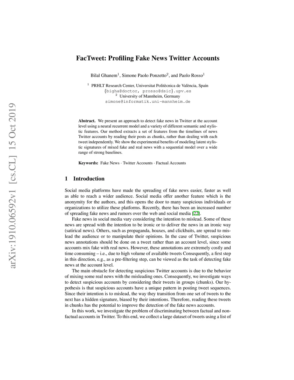 We present an approach to detect fake news in Twitter at the account level using a neural recurrent model and a variety of different semantic and stylistic features. Our method extracts a set of features from the timelines of news Twitter accounts by reading their posts as chunks, rather than dealing with each tweet independently. We show the experimental benefits of modeling latent stylistic signatures of mixed fake and real news with a sequential model over a wide range of strong baselines.