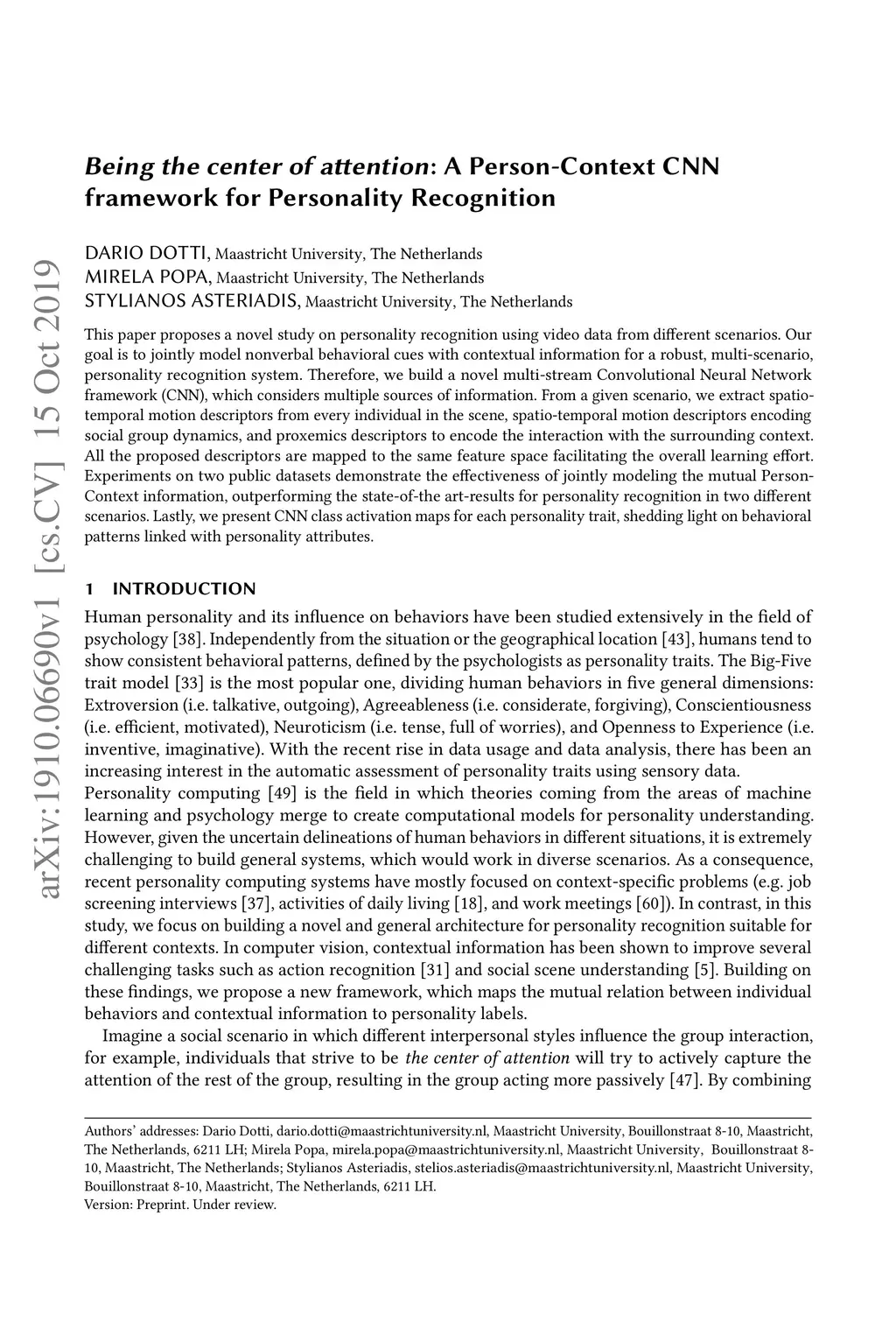 This paper proposes a novel study on personality recognition using video data from different scenarios. Our goal is to jointly model nonverbal behavioral cues with contextual information for a robust, multi-scenario, personality recognition system. Therefore, we build a novel multi-stream Convolutional Neural Network framework (CNN), which considers multiple sources of information. From a given scenario, we extract spatio-temporal motion descriptors from every individual in the scene, spatio-temporal motion descriptors encoding social group dynamics, and proxemics descriptors to encode the interaction with the surrounding context. All the proposed descriptors are mapped to the same feature space facilitating the overall learning effort. Experiments on two public datasets demonstrate the effectiveness of jointly modeling the mutual Person-Context information, outperforming the state-of-the art-results for personality recognition in two different scenarios. Lastly, we present CNN class activation maps for each personality trait, shedding light on behavioral patterns linked with personality attributes.