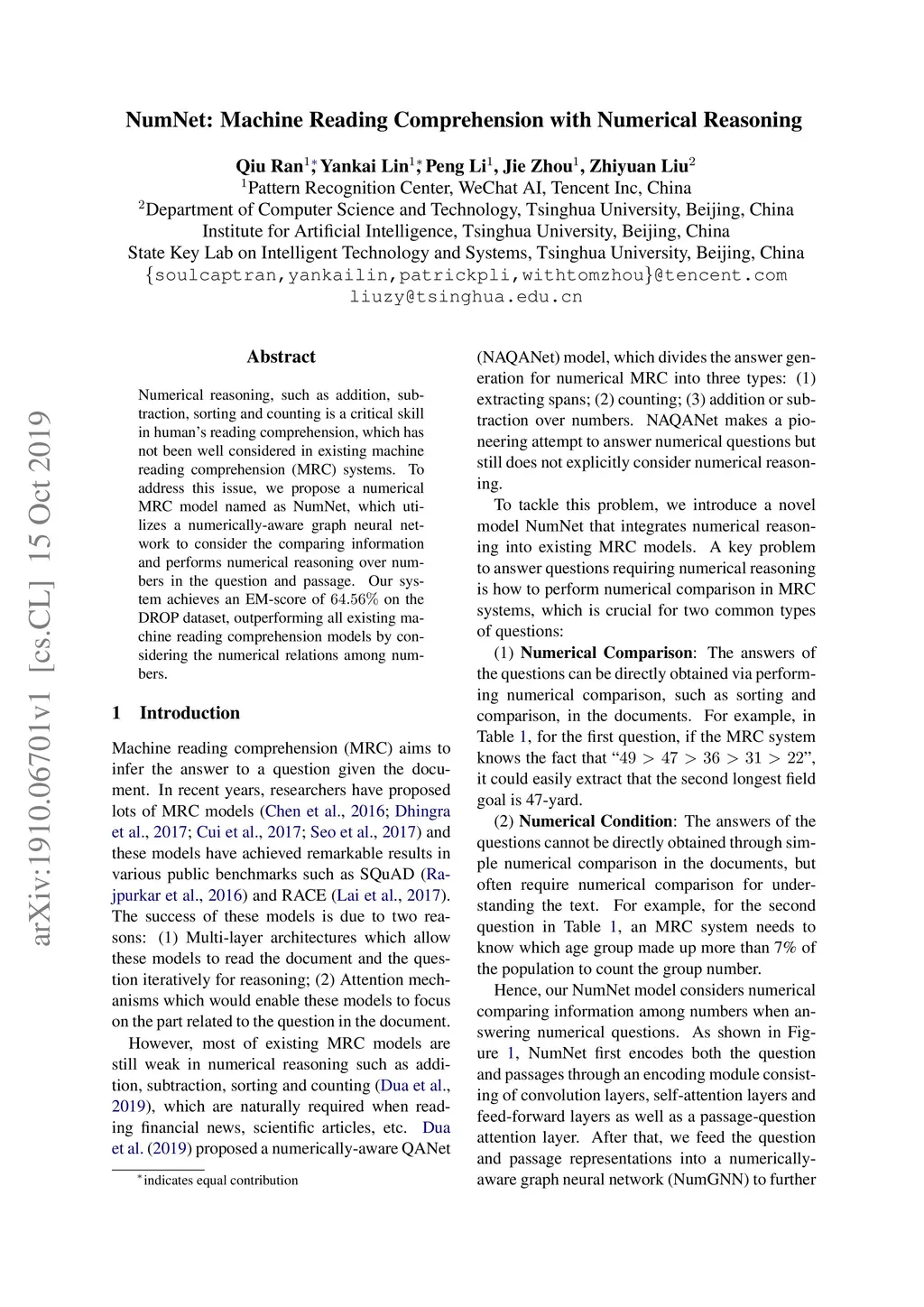 NumNet: Machine Reading Comprehension with Numerical Reasoning
