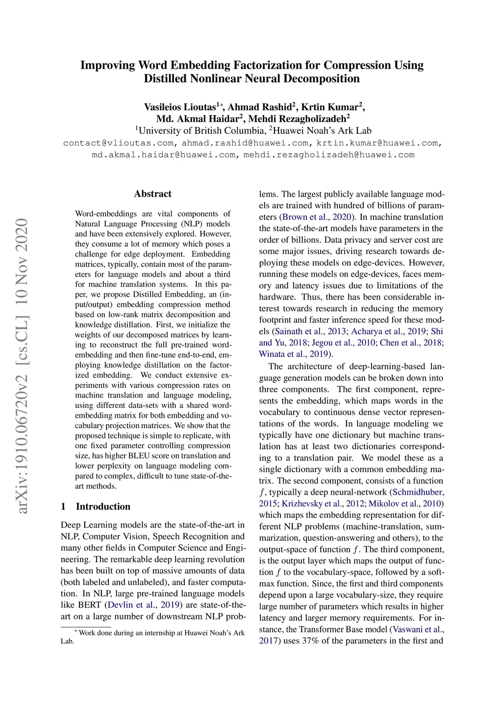 Word-embeddings are vital components of Natural Language Processing (NLP) models and have been extensively explored. However, they consume a lot of memory which poses a challenge for edge deployment. Embedding matrices, typically, contain most of the parameters for language models and about a third for machine translation systems. In this paper, we propose Distilled Embedding, an (input/output) embedding compression method based on low-rank matrix decomposition and knowledge distillation. First, we initialize the weights of our decomposed matrices by learning to reconstruct the full pre-trained word-embedding and then fine-tune end-to-end, employing knowledge distillation on the factorized embedding. We conduct extensive experiments with various compression rates on machine translation and language modeling, using different data-sets with a shared word-embedding matrix for both embedding and vocabulary projection matrices. We show that the proposed technique is simple to replicate, with one fixed parameter controlling compression size, has higher BLEU score on translation and lower perplexity on language modeling compared to complex, difficult to tune state-of-the-art methods.