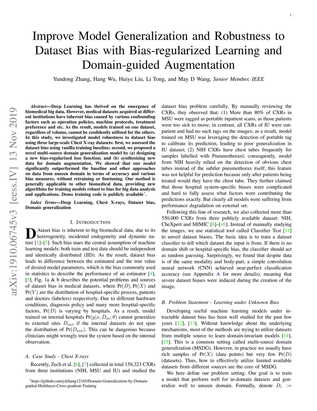 Deep Learning has thrived on the emergence of biomedical big data. However, medical datasets acquired at different institutions have inherent bias caused by various confounding factors such as operation policies, machine protocols, treatment preference and etc. As the result, models trained on one dataset, regardless of volume, cannot be confidently utilized for the others. In this study, we investigated model robustness to dataset bias using three large-scale Chest X-ray datasets: first, we assessed the dataset bias using vanilla training baseline; second, we proposed a novel multi-source domain generalization model by (a) designing a new bias-regularized loss function; and (b) synthesizing new data for domain augmentation. We showed that our model significantly outperformed the baseline and other approaches on data from unseen domain in terms of accuracy and various bias measures, without retraining or finetuning. Our method is generally applicable to other biomedical data, providing new algorithms for training models robust to bias for big data analysis and applications. Demo training code is publicly available.