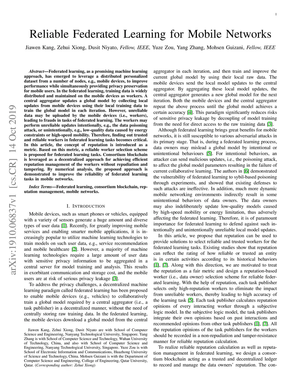 Federated learning, as a promising machine learning approach, has emerged to leverage a distributed personalized dataset from a number of nodes, e.g., mobile devices, to improve performance while simultaneously providing privacy preservation for mobile users. In the federated learning, training data is widely distributed and maintained on the mobile devices as workers. A central aggregator updates a global model by collecting local updates from mobile devices using their local training data to train the global model in each iteration. However, unreliable data may be uploaded by the mobile devices (i.e., workers), leading to frauds in tasks of federated learning. The workers may perform unreliable updates intentionally, e.g., the data poisoning attack, or unintentionally, e.g., low-quality data caused by energy constraints or high-speed mobility. Therefore, finding out trusted and reliable workers in federated learning tasks becomes critical. In this article, the concept of reputation is introduced as a metric. Based on this metric, a reliable worker selection scheme is proposed for federated learning tasks. Consortium blockchain is leveraged as a decentralized approach for achieving efficient reputation management of the workers without repudiation and tampering. By numerical analysis, the proposed approach is demonstrated to improve the reliability of federated learning tasks in mobile networks.