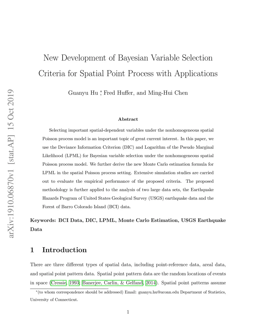 Selecting important spatial-dependent variables under the nonhomogeneous spatial Poisson process model is an important topic of great current interest. In this paper, we use the Deviance Information Criterion (DIC) and Logarithm of the Pseudo Marginal Likelihood (LPML) for Bayesian variable selection under the nonhomogeneous spatial Poisson process model. We further derive the new Monte Carlo estimation formula for LPML in the spatial Poisson process setting. Extensive simulation studies are carried out to evaluate the empirical performance of the proposed criteria. The proposed methodology is further applied to the analysis of two large data sets, the Earthquake Hazards Program of United States Geological Survey (USGS) earthquake data and the Forest of Barro Colorado Island (BCI) data.