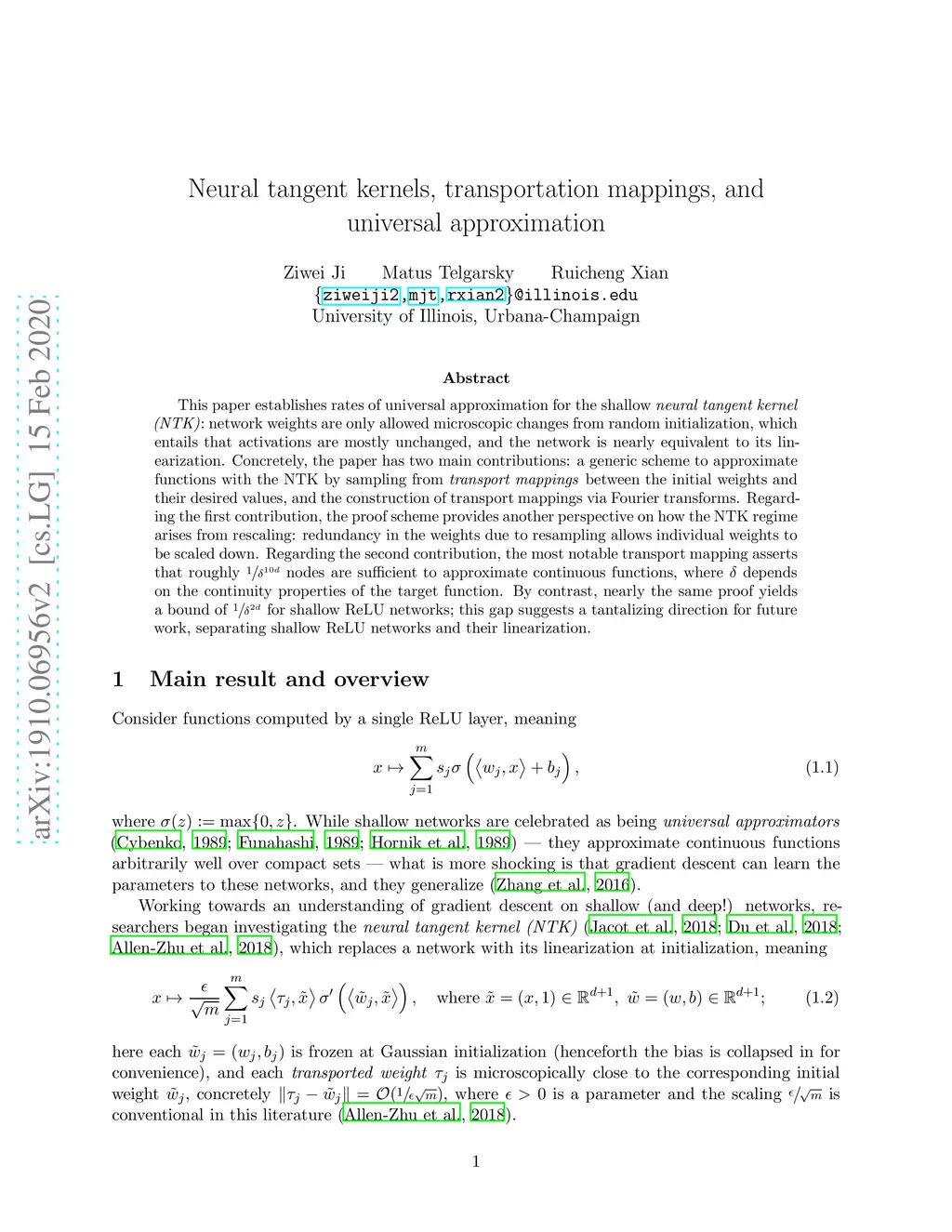 This paper establishes rates of universal approximation for the shallow neural tangent kernel (NTK): network weights are only allowed microscopic changes from random initialization, which entails that activations are mostly unchanged, and the network is nearly equivalent to its linearization. Concretely, the paper has two main contributions: a generic scheme to approximate functions with the NTK by sampling from transport mappings between the initial weights and their desired values, and the construction of transport mappings via Fourier transforms. Regarding the first contribution, the proof scheme provides another perspective on how the NTK regime arises from rescaling: redundancy in the weights due to resampling allows individual weights to be scaled down. Regarding the second contribution, the most notable transport mapping asserts that roughly nodes are sufficient to approximate continuous functions, where depends on the continuity properties of the target function. By contrast, nearly the same proof yields a bound of for shallow ReLU networks; this gap suggests a tantalizing direction for future work, separating shallow ReLU networks and their linearization.