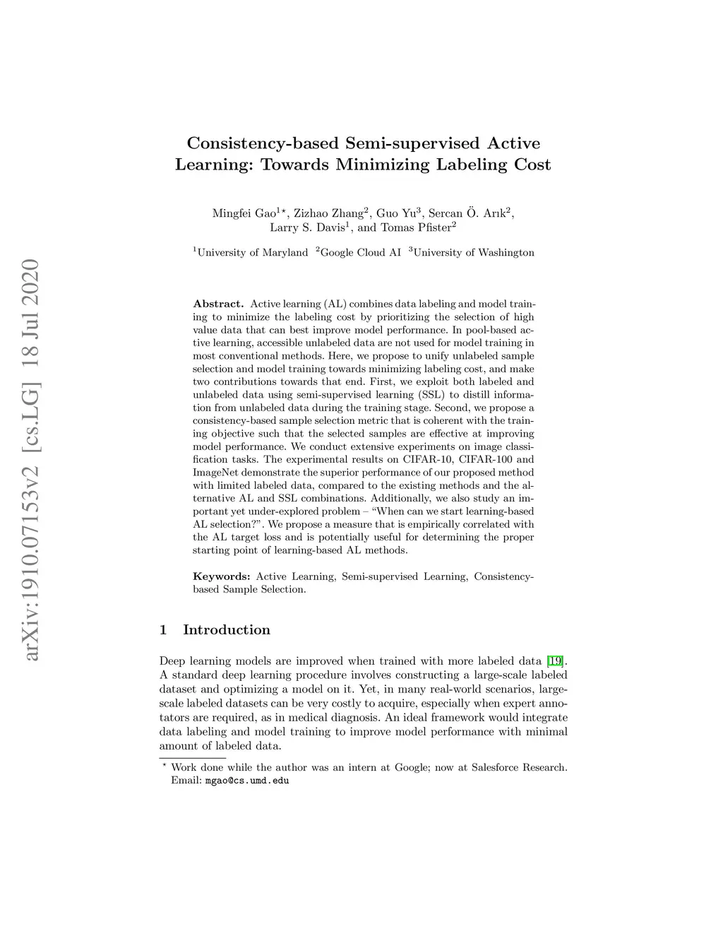 Active learning (AL) combines data labeling and model training to minimize the labeling cost by prioritizing the selection of high value data that can best improve model performance. In pool-based active learning, accessible unlabeled data are not used for model training in most conventional methods. Here, we propose to unify unlabeled sample selection and model training towards minimizing labeling cost, and make two contributions towards that end. First, we exploit both labeled and unlabeled data using semi-supervised learning (SSL) to distill information from unlabeled data during the training stage. Second, we propose a consistency-based sample selection metric that is coherent with the training objective such that the selected samples are effective at improving model performance. We conduct extensive experiments on image classification tasks. The experimental results on CIFAR-10, CIFAR-100 and ImageNet demonstrate the superior performance of our proposed method with limited labeled data, compared to the existing methods and the alternative AL and SSL combinations. Additionally, we study an important yet under-explored problem -- "When can we start learning-based AL selection?". We propose a measure that is empirically correlated with the AL target loss and is potentially useful for determining the proper starting point of learning-based AL methods.
