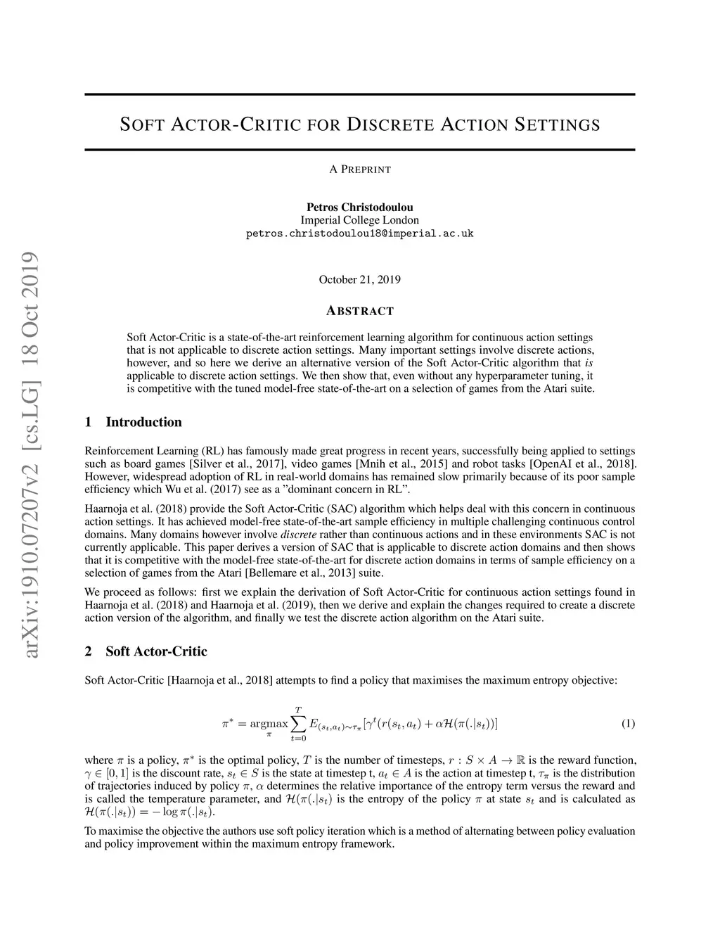 Soft Actor-Critic is a state-of-the-art reinforcement learning algorithm for continuous action settings that is not applicable to discrete action settings. Many important settings involve discrete actions, however, and so here we derive an alternative version of the Soft Actor-Critic algorithm that is applicable to discrete action settings. We then show that, even without any hyperparameter tuning, it is competitive with the tuned model-free state-of-the-art on a selection of games from the Atari suite.
