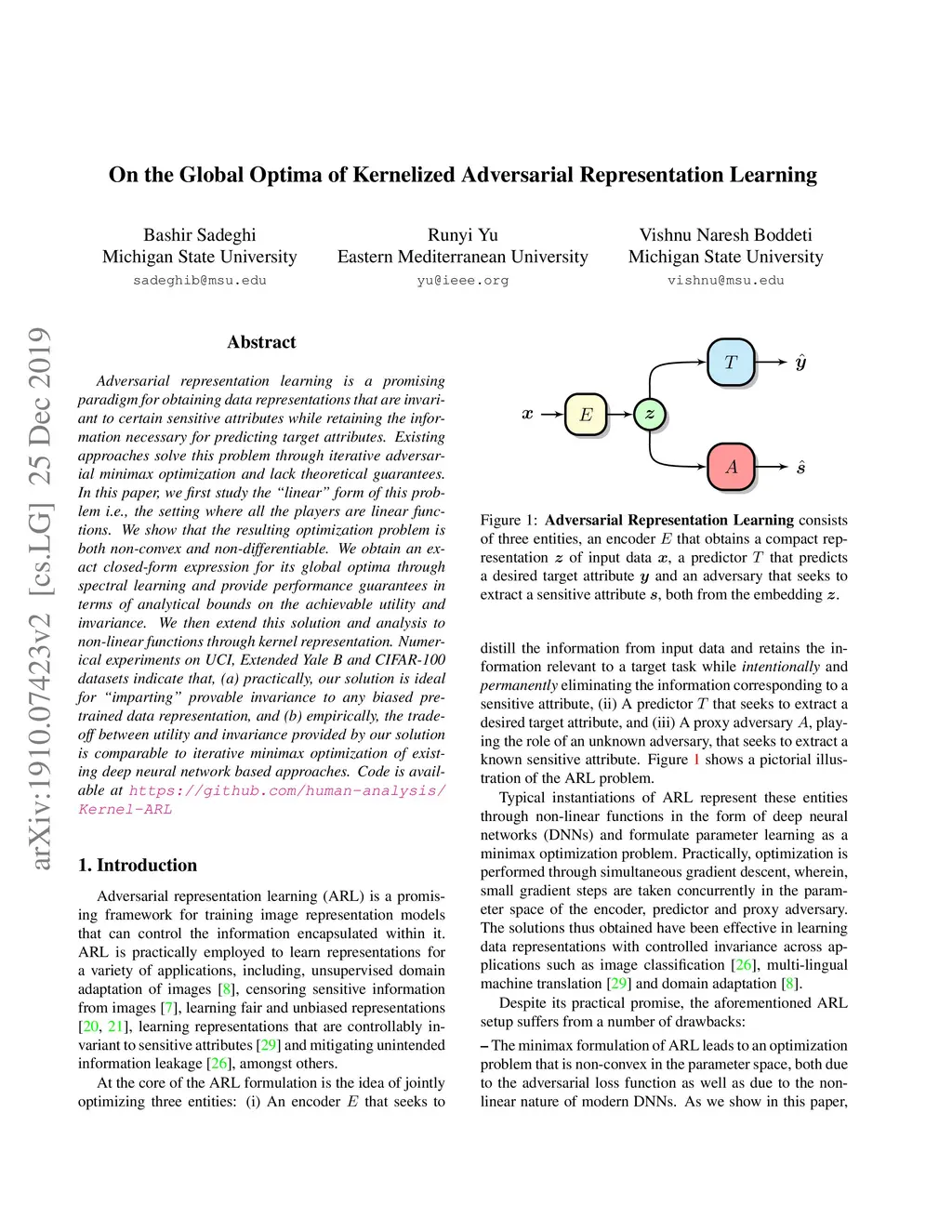 On the Global Optima of Kernelized Adversarial Representation Learning