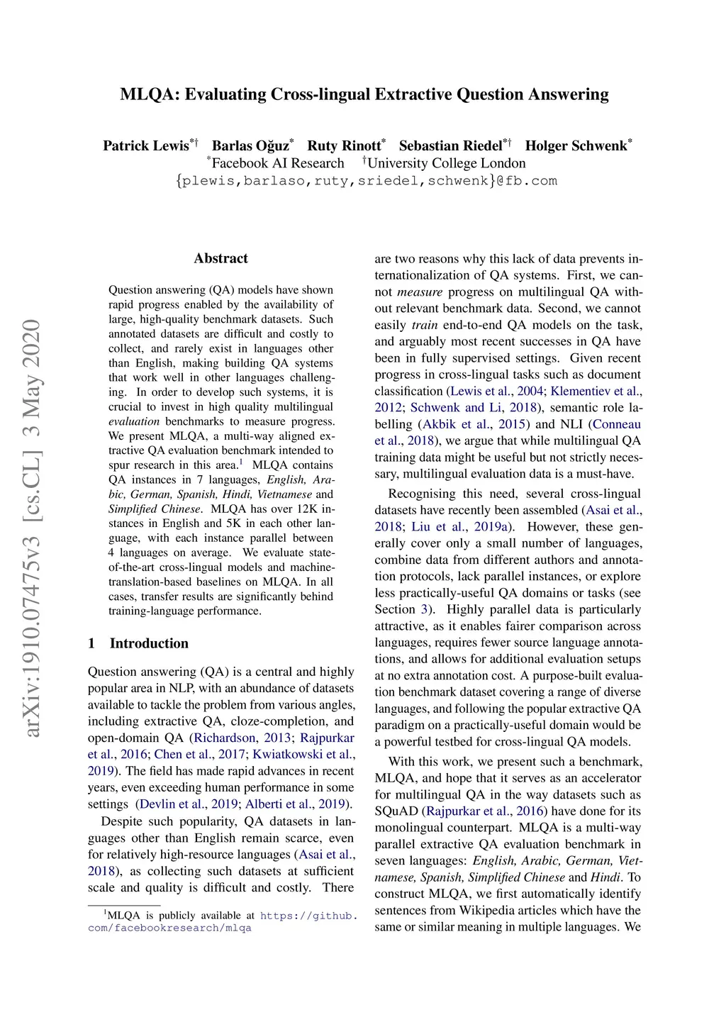 Question answering (QA) models have shown rapid progress enabled by the availability of large, high-quality benchmark datasets. Such annotated datasets are difficult and costly to collect, and rarely exist in languages other than English, making training QA systems in other languages challenging. An alternative to building large monolingual training datasets is to develop cross-lingual systems which can transfer to a target language without requiring training data in that language. In order to develop such systems, it is crucial to invest in high quality multilingual evaluation benchmarks to measure progress. We present MLQA, a multi-way aligned extractive QA evaluation benchmark intended to spur research in this area. MLQA contains QA instances in 7 languages, namely English, Arabic, German, Spanish, Hindi, Vietnamese and Simplified Chinese. It consists of over 12K QA instances in English and 5K in each other language, with each QA instance being parallel between 4 languages on average. MLQA is built using a novel alignment context strategy on Wikipedia articles, and serves as a cross-lingual extension to existing extractive QA datasets. We evaluate current state-of-the-art cross-lingual representations on MLQA, and also provide machine-translation-based baselines. In all cases, transfer results are shown to be significantly behind training-language performance.