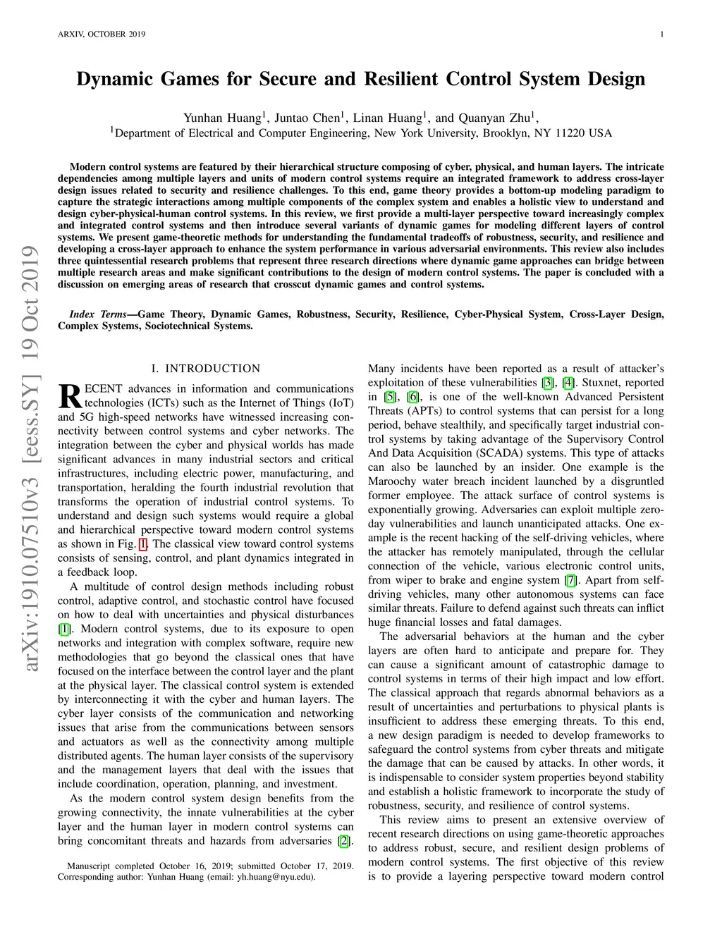 Modern control systems are featured by their hierarchical structure composing of cyber, physical, and human layers. The intricate dependencies among multiple layers and units of modern control systems require an integrated framework to address cross-layer design issues related to security and resilience challenges. To this end, game theory provides a bottom-up modeling paradigm to capture the strategic interactions among multiple components of the complex system and enables a holistic view to understand and design cyber-physical-human control systems. In this review, we first provide a multi-layer perspective toward increasingly complex and integrated control systems and then introduce several variants of dynamic games for modeling different layers of control systems. We present game-theoretic methods for understanding the fundamental tradeoffs of robustness, security, and resilience and developing a clean-slate cross-layer approach to enhance the system performance in various adversarial environments. This review also includes three quintessential research problems that represent three research directions where dynamic game approaches can bridge between multiple research areas and make significant contributions to the design of modern control systems. The paper is concluded with a discussion on emerging areas of research that crosscut dynamic games and control systems.
