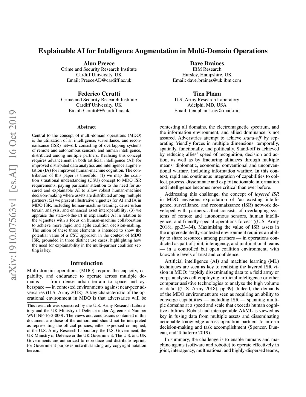 Central to the concept of multi-domain operations (MDO) is the utilization of an intelligence, surveillance, and reconnaissance (ISR) network consisting of overlapping systems of remote and autonomous sensors, and human intelligence, distributed among multiple partners. Realising this concept requires advancement in both artificial intelligence (AI) for improved distributed data analytics and intelligence augmentation (IA) for improved human-machine cognition. The contribution of this paper is threefold: (1) we map the coalition situational understanding (CSU) concept to MDO ISR requirements, paying particular attention to the need for assured and explainable AI to allow robust human-machine decision-making where assets are distributed among multiple partners; (2) we present illustrative vignettes for AI and IA in MDO ISR, including human-machine teaming, dense urban terrain analysis, and enhanced asset interoperability; (3) we appraise the state-of-the-art in explainable AI in relation to the vignettes with a focus on human-machine collaboration to achieve more rapid and agile coalition decision-making. The union of these three elements is intended to show the potential value of a CSU approach in the context of MDO ISR, grounded in three distinct use cases, highlighting how the need for explainability in the multi-partner coalition setting is key.