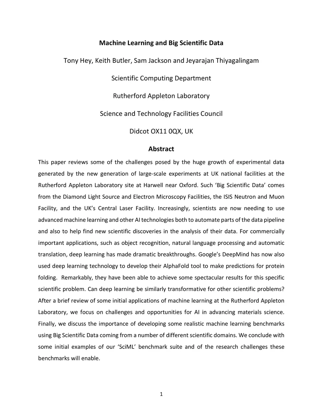 This paper reviews some of the challenges posed by the huge growth of experimental data generated by the new generation of large-scale experiments at UK national facilities at the Rutherford Appleton Laboratory site at Harwell near Oxford. Such "Big Scientific Data" comes from the Diamond Light Source and Electron Microscopy Facilities, the ISIS Neutron and Muon Facility, and the UK's Central Laser Facility. Increasingly, scientists are now needing to use advanced machine learning and other AI technologies both to automate parts of the data pipeline and also to help find new scientific discoveries in the analysis of their data. For commercially important applications, such as object recognition, natural language processing and automatic translation, deep learning has made dramatic breakthroughs. Google's DeepMind has now also used deep learning technology to develop their AlphaFold tool to make predictions for protein folding. Remarkably, they have been able to achieve some spectacular results for this specific scientific problem. Can deep learning be similarly transformative for other scientific problems? After a brief review of some initial applications of machine learning at the Rutherford Appleton Laboratory, we focus on challenges and opportunities for AI in advancing materials science. Finally, we discuss the importance of developing some realistic machine learning benchmarks using Big Scientific Data coming from a number of different scientific domains. We conclude with some initial examples of our "SciML" benchmark suite and of the research challenges these benchmarks will enable.