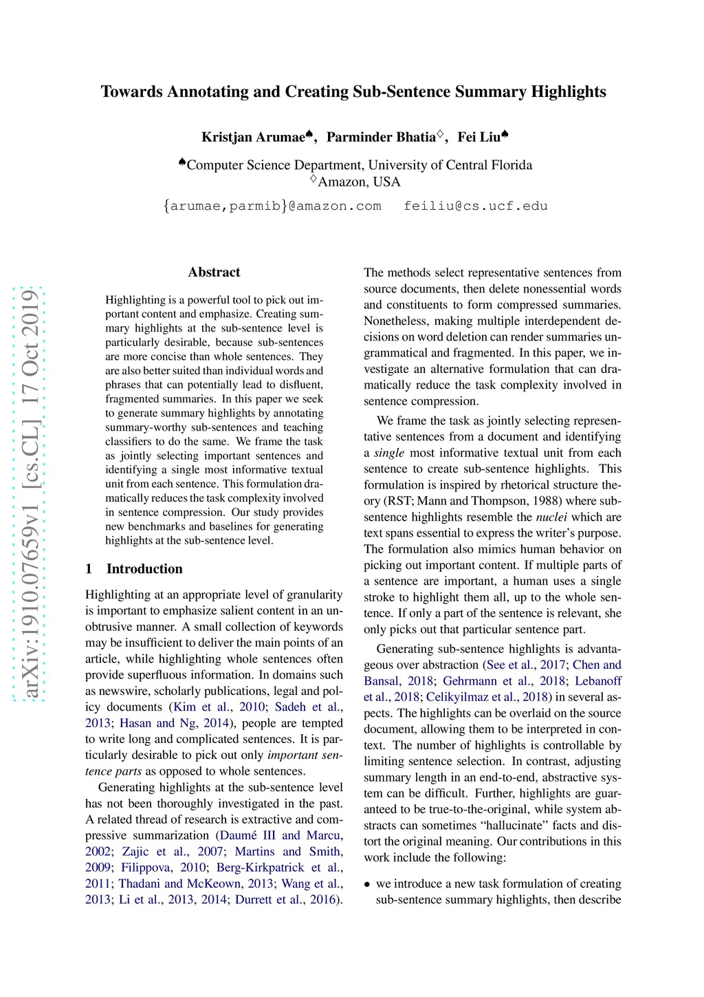 Towards Annotating and Creating Sub-Sentence Summary Highlights