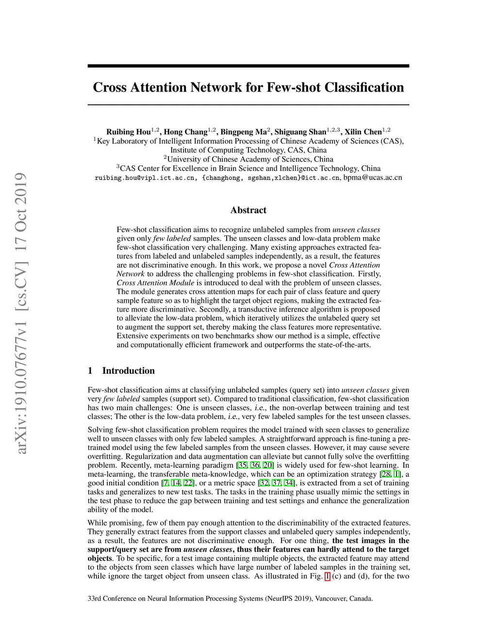 Few-shot classification aims to recognize unlabeled samples from unseen classes given only few labeled samples. The unseen classes and low-data problem make few-shot classification very challenging. Many existing approaches extracted features from labeled and unlabeled samples independently, as a result, the features are not discriminative enough. In this work, we propose a novel Cross Attention Network to address the challenging problems in few-shot classification. Firstly, Cross Attention Module is introduced to deal with the problem of unseen classes. The module generates cross attention maps for each pair of class feature and query sample feature so as to highlight the target object regions, making the extracted feature more discriminative. Secondly, a transductive inference algorithm is proposed to alleviate the low-data problem, which iteratively utilizes the unlabeled query set to augment the support set, thereby making the class features more representative. Extensive experiments on two benchmarks show our method is a simple, effective and computationally efficient framework and outperforms the state-of-the-arts.