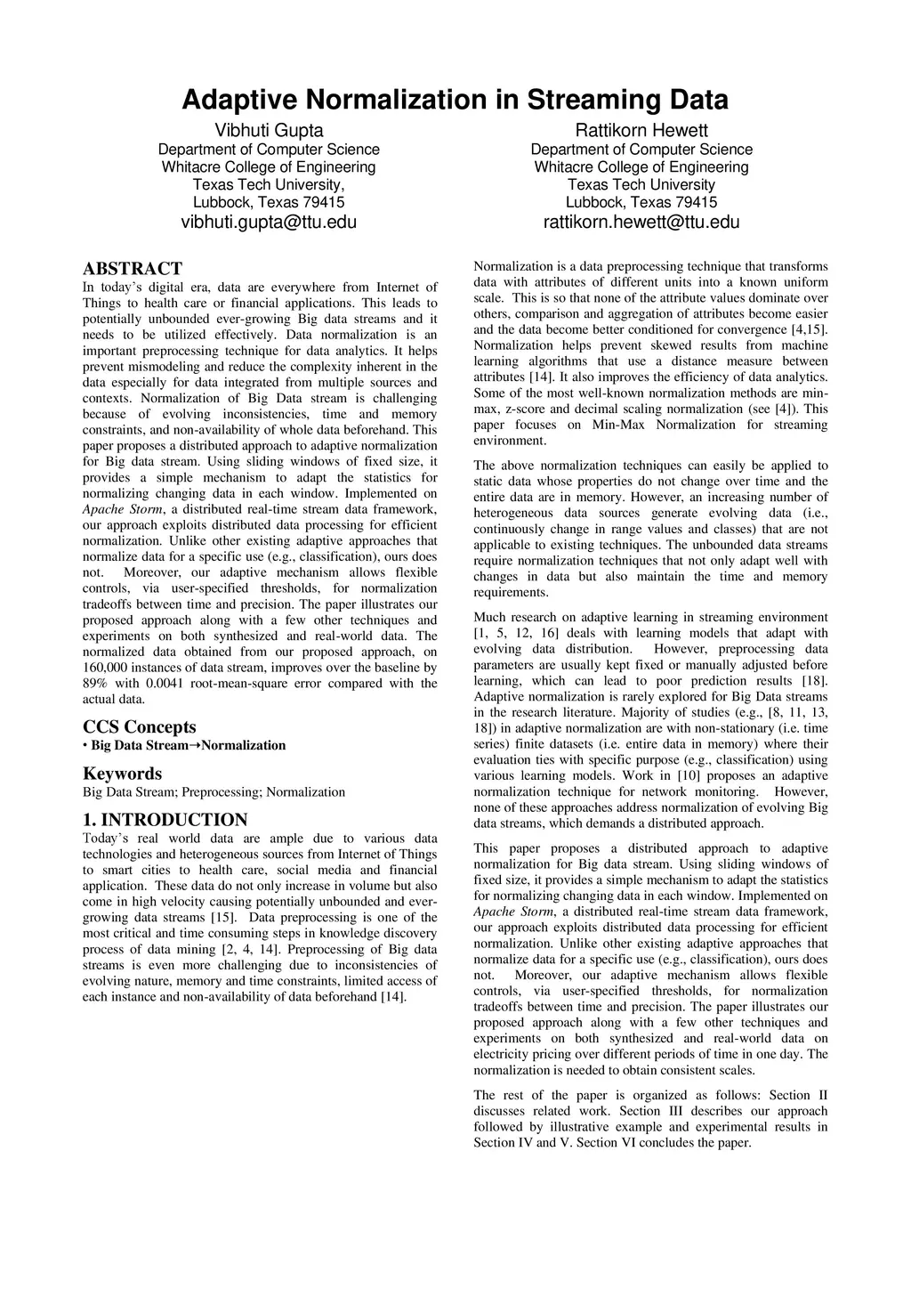 In todays digital era, data are everywhere from Internet of Things to health care or financial applications. This leads to potentially unbounded ever-growing Big data streams and it needs to be utilized effectively. Data normalization is an important preprocessing technique for data analytics. It helps prevent mismodeling and reduce the complexity inherent in the data especially for data integrated from multiple sources and contexts. Normalization of Big Data stream is challenging because of evolving inconsistencies, time and memory constraints, and non-availability of whole data beforehand. This paper proposes a distributed approach to adaptive normalization for Big data stream. Using sliding windows of fixed size, it provides a simple mechanism to adapt the statistics for normalizing changing data in each window. Implemented on Apache Storm, a distributed real-time stream data framework, our approach exploits distributed data processing for efficient normalization. Unlike other existing adaptive approaches that normalize data for a specific use (e.g., classification), ours does not. Moreover, our adaptive mechanism allows flexible controls, via user-specified thresholds, for normalization tradeoffs between time and precision. The paper illustrates our proposed approach along with a few other techniques and experiments on both synthesized and real-world data. The normalized data obtained from our proposed approach, on 160,000 instances of data stream, improves over the baseline by 89% with 0.0041 root-mean-square error compared with the actual data.