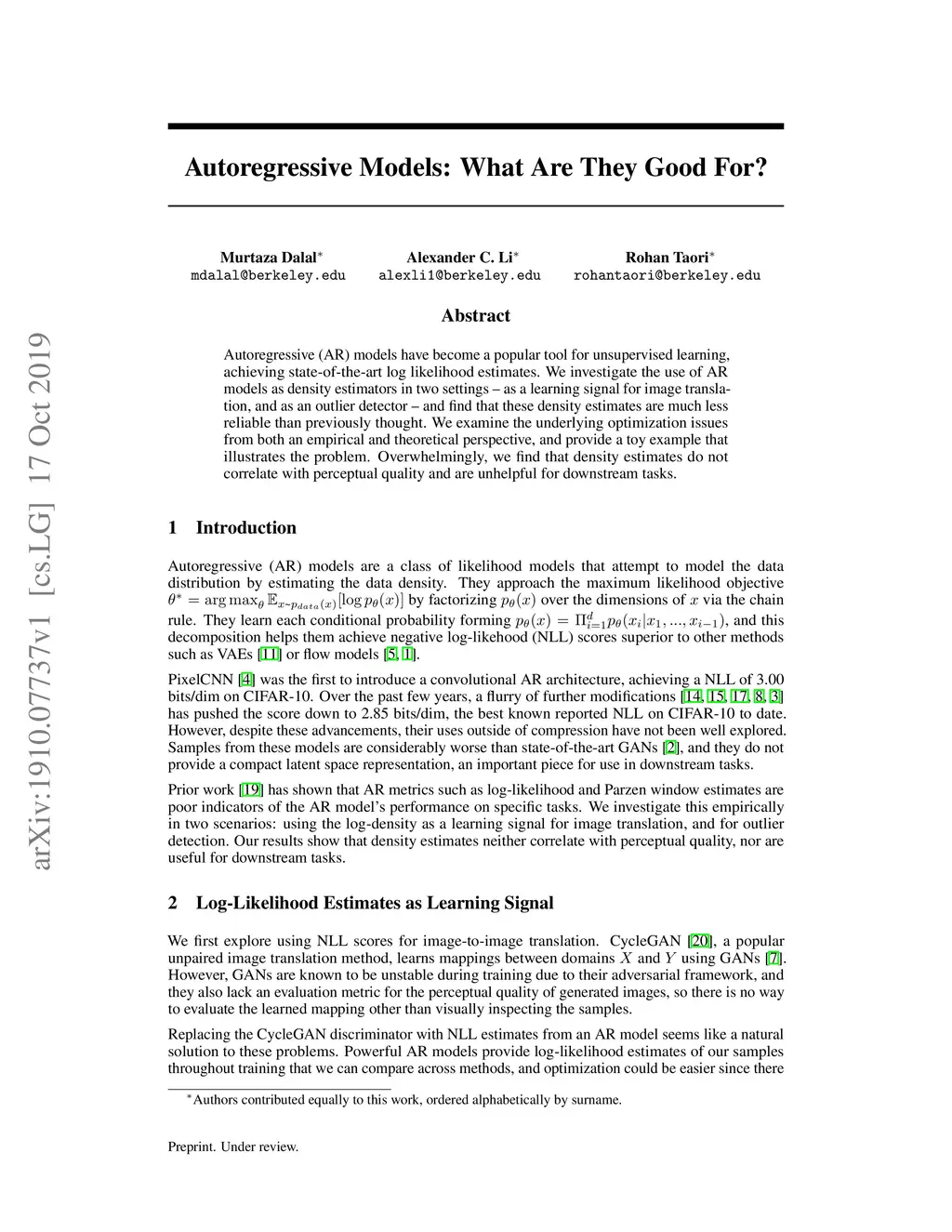 Autoregressive (AR) models have become a popular tool for unsupervised learning, achieving state-of-the-art log likelihood estimates. We investigate the use of AR models as density estimators in two settings -- as a learning signal for image translation, and as an outlier detector -- and find that these density estimates are much less reliable than previously thought. We examine the underlying optimization issues from both an empirical and theoretical perspective, and provide a toy example that illustrates the problem. Overwhelmingly, we find that density estimates do not correlate with perceptual quality and are unhelpful for downstream tasks.