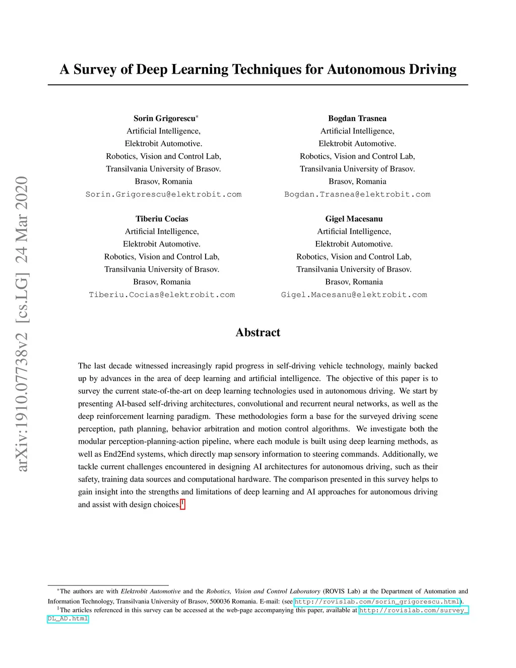 The last decade witnessed increasingly rapid progress in self-driving vehicle technology, mainly backed up by advances in the area of deep learning and artificial intelligence. The objective of this paper is to survey the current state-of-the-art on deep learning technologies used in autonomous driving. We start by presenting AI-based self-driving architectures, convolutional and recurrent neural networks, as well as the deep reinforcement learning paradigm. These methodologies form a base for the surveyed driving scene perception, path planning, behavior arbitration and motion control algorithms. We investigate both the modular perception-planning-action pipeline, where each module is built using deep learning methods, as well as End2End systems, which directly map sensory information to steering commands. Additionally, we tackle current challenges encountered in designing AI architectures for autonomous driving, such as their safety, training data sources and computational hardware. The comparison presented in this survey helps to gain insight into the strengths and limitations of deep learning and AI approaches for autonomous driving and assist with design choices