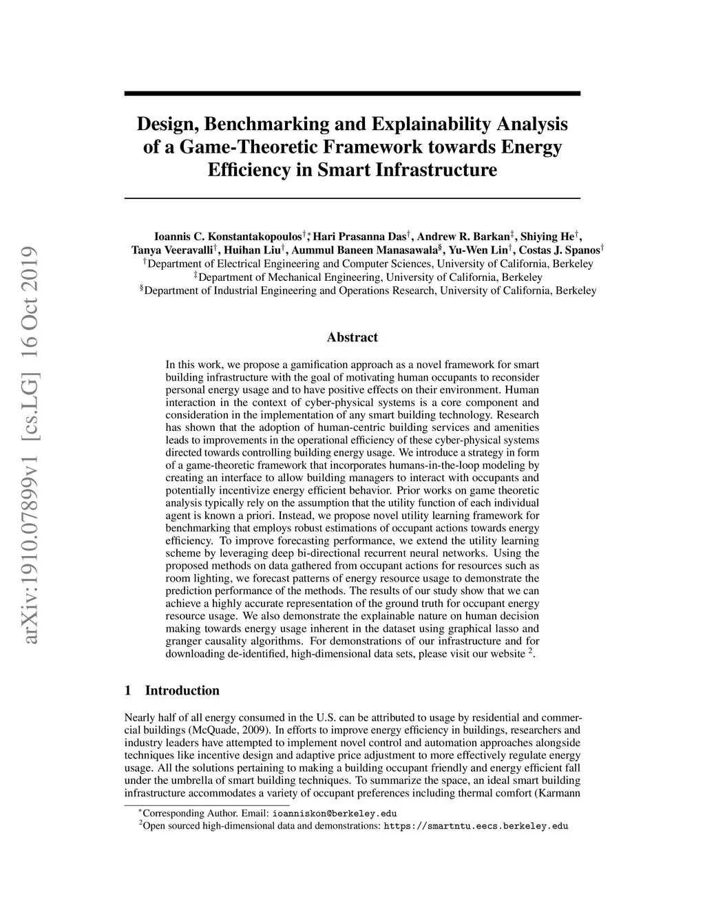 In this paper, we propose a gamification approach as a novel framework for smart building infrastructure with the goal of motivating human occupants to reconsider personal energy usage and to have positive effects on their environment. Human interaction in the context of cyber-physical systems is a core component and consideration in the implementation of any smart building technology. Research has shown that the adoption of human-centric building services and amenities leads to improvements in the operational efficiency of these cyber-physical systems directed towards controlling building energy usage. We introduce a strategy in form of a game-theoretic framework that incorporates humans-in-the-loop modeling by creating an interface to allow building managers to interact with occupants and potentially incentivize energy efficient behavior. Prior works on game theoretic analysis typically rely on the assumption that the utility function of each individual agent is known a priori. Instead, we propose novel utility learning framework for benchmarking that employs robust estimations of occupant actions towards energy efficiency. To improve forecasting performance, we extend the utility learning scheme by leveraging deep bi-directional recurrent neural networks. Using the proposed methods on data gathered from occupant actions for resources such as room lighting, we forecast patterns of energy resource usage to demonstrate the prediction performance of the methods. The results of our study show that we can achieve a highly accurate representation of the ground truth for occupant energy resource usage. We also demonstrate the explainable nature on human decision making towards energy usage inherent in the dataset using graphical lasso and granger causality algorithms. Finally, we open source the de-identified, high-dimensional data pertaining to the energy game-theoretic framework.