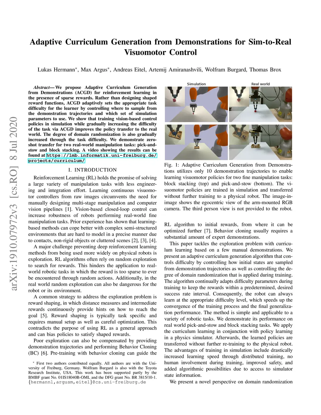 We propose Adaptive Curriculum Generation from Demonstrations (ACGD) for reinforcement learning in the presence of sparse rewards. Rather than designing shaped reward functions, ACGD adaptively sets the appropriate task difficulty for the learner by controlling where to sample from the demonstration trajectories and which set of simulation parameters to use. We show that training vision-based control policies in simulation while gradually increasing the difficulty of the task via ACGD improves the policy transfer to the real world. The degree of domain randomization is also gradually increased through the task difficulty. We demonstrate zero-shot transfer for two real-world manipulation tasks: pick-and-stow and block stacking. A video showing the results can be found at https://lmb.informatik.uni-freiburg.de/projects/curriculum/