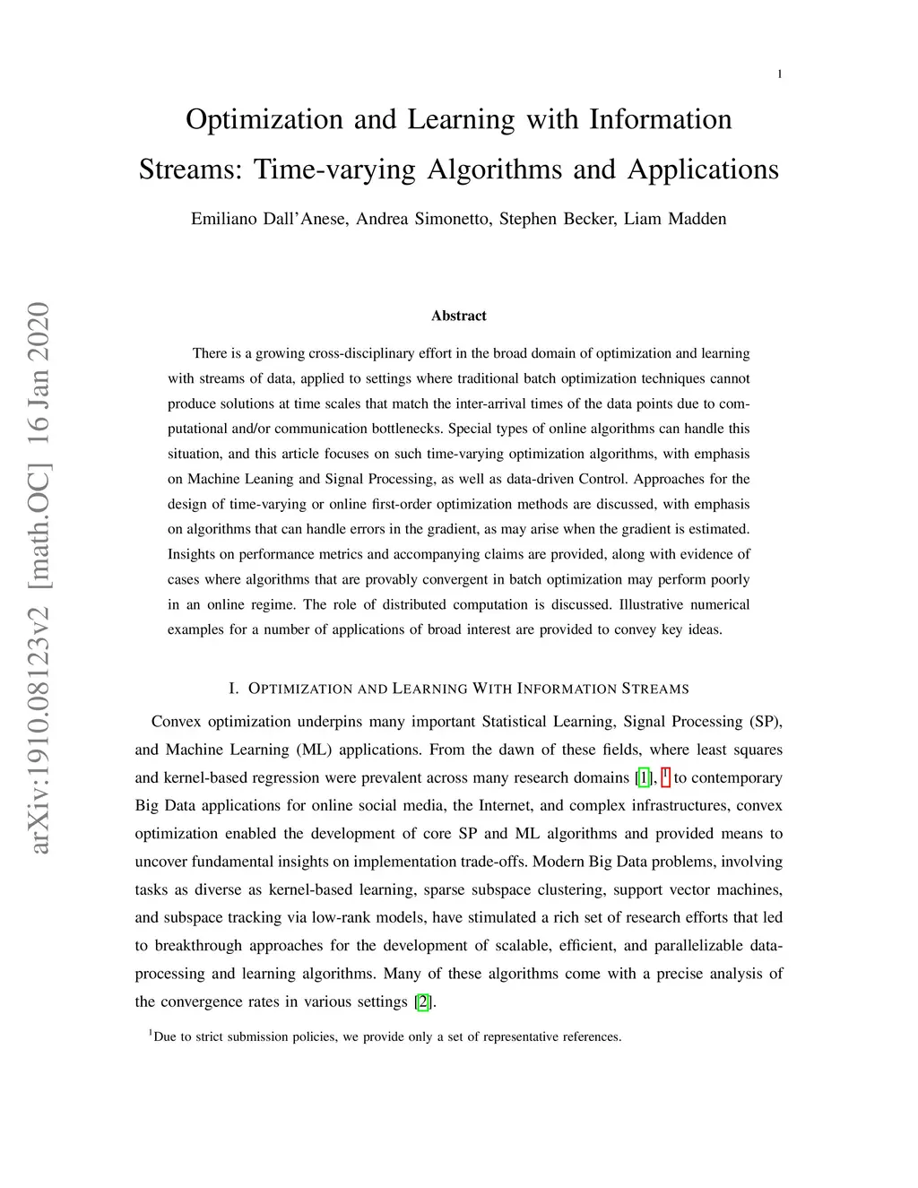 There is a growing cross-disciplinary effort in the broad domain of optimization and learning with streams of data, applied to settings where traditional batch optimization techniques cannot produce solutions at time scales that match the inter-arrival times of the data points due to computational and/or communication bottlenecks. Special types of online algorithms can handle this situation, and this article focuses on such time-varying optimization algorithms, with emphasis on Machine Leaning and Signal Processing, as well as data-driven Control. Approaches for the design of time-varying or online first-order optimization methods are discussed, with emphasis on algorithms that can handle errors in the gradient, as may arise when the gradient is estimated. Insights on performance metrics and accompanying claims are provided, along with evidence of cases where algorithms that are provably convergent in batch optimization may perform poorly in an online regime. The role of distributed computation is discussed. Illustrative numerical examples for a number of applications of broad interest are provided to convey key ideas.