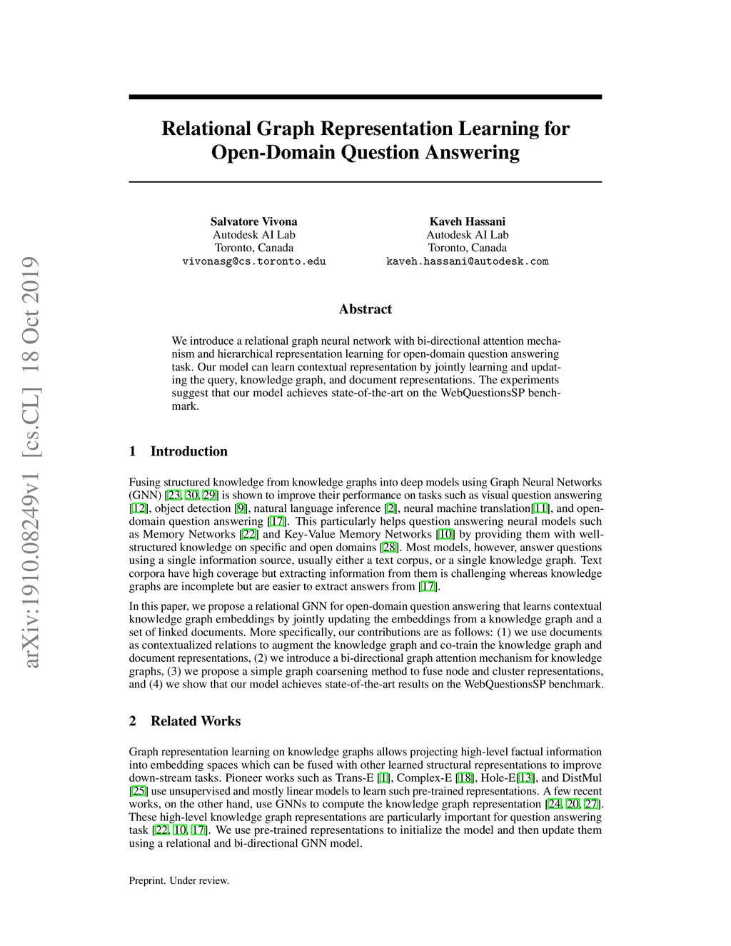 We introduce a relational graph neural network with bi-directional attention mechanism and hierarchical representation learning for open-domain question answering task. Our model can learn contextual representation by jointly learning and updating the query, knowledge graph, and document representations. The experiments suggest that our model achieves state-of-the-art on the WebQuestionsSP benchmark.