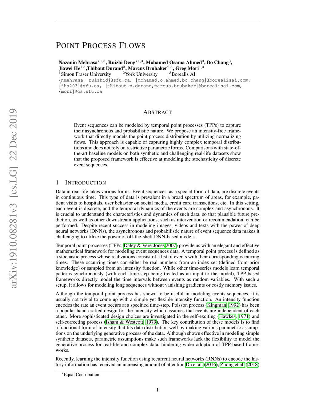 Event sequences can be modeled by temporal point processes (TPPs) to capture their asynchronous and probabilistic nature. We propose an intensity-free framework that directly models the point process distribution by utilizing normalizing flows. This approach is capable of capturing highly complex temporal distributions and does not rely on restrictive parametric forms. Comparisons with state-of-the-art baseline models on both synthetic and challenging real-life datasets show that the proposed framework is effective at modeling the stochasticity of discrete event sequences.