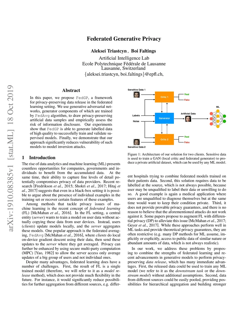 In this paper, we propose FedGP, a framework for privacy-preserving data release in the federated learning setting. We use generative adversarial networks, generator components of which are trained by FedAvg algorithm, to draw privacy-preserving artificial data samples and empirically assess the risk of information disclosure. Our experiments show that FedGP is able to generate labelled data of high quality to successfully train and validate supervised models. Finally, we demonstrate that our approach significantly reduces vulnerability of such models to model inversion attacks.