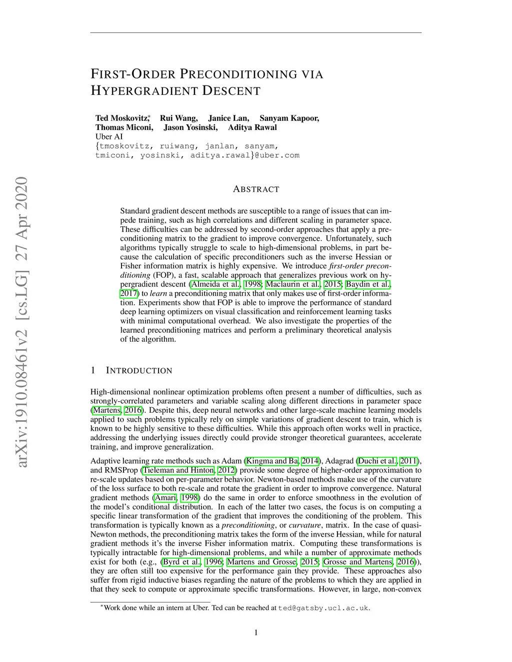 Standard gradient descent methods are susceptible to a range of issues that can impede training, such as high correlations and different scaling in parameter space.These difficulties can be addressed by second-order approaches that apply a pre-conditioning matrix to the gradient to improve convergence. Unfortunately, such algorithms typically struggle to scale to high-dimensional problems, in part because the calculation of specific preconditioners such as the inverse Hessian or Fisher information matrix is highly expensive. We introduce first-order preconditioning (FOP), a fast, scalable approach that generalizes previous work on hypergradient descent (Almeida et al., 1998; Maclaurin et al., 2015; Baydin et al.,2017) to learn a preconditioning matrix that only makes use of first-order information. Experiments show that FOP is able to improve the performance of standard deep learning optimizers on visual classification and reinforcement learning tasks with minimal computational overhead. We also investigate the properties of the learned preconditioning matrices and perform a preliminary theoretical analysis of the algorithm.
