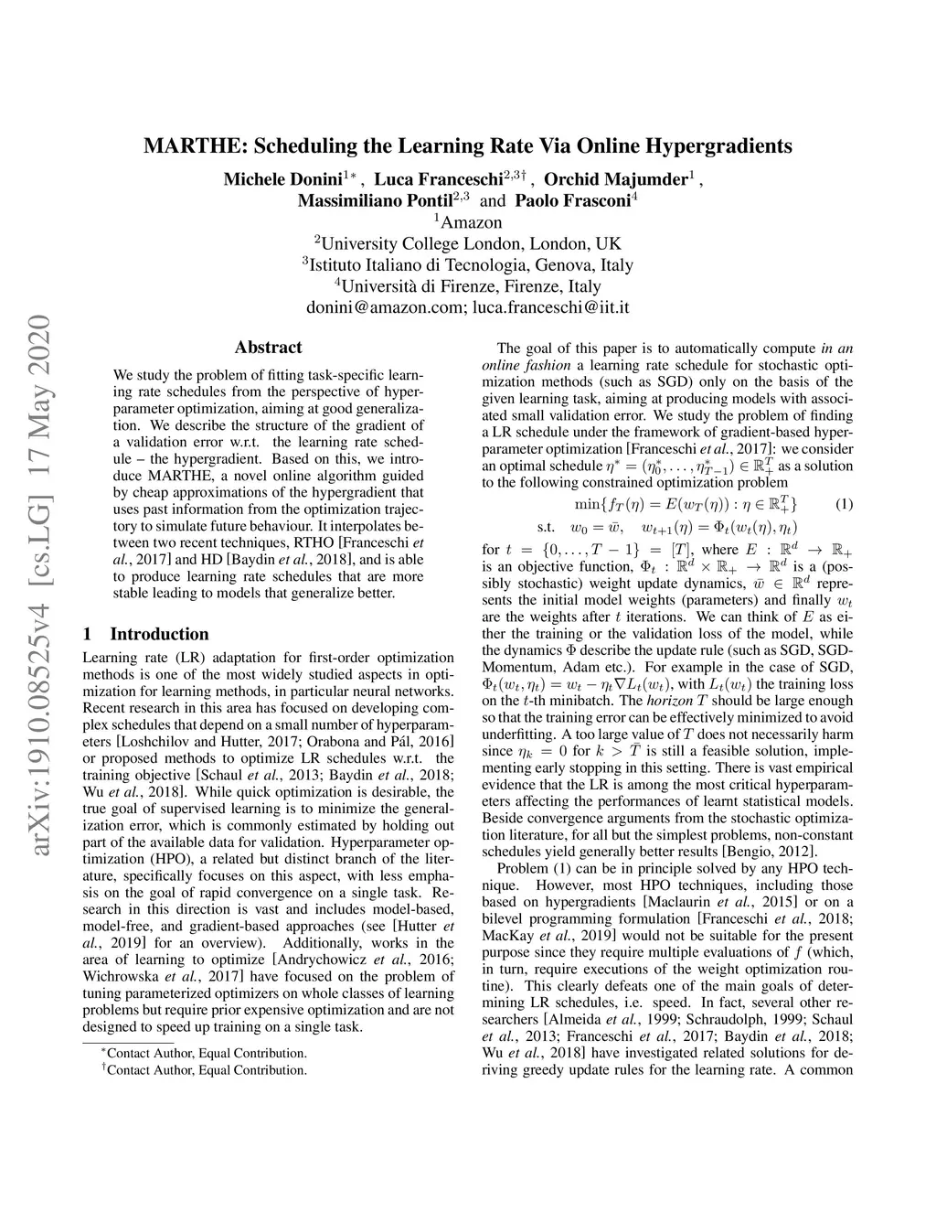 We study the problem of fitting task-specific learning rate schedules from the perspective of hyperparameter optimization, aiming at good generalization. We describe the structure of the gradient of a validation error w.r.t. the learning rate schedule - the hypergradient. Based on this, we introduce MARTHE, a novel online algorithm guided by cheap approximations of the hypergradient that uses past information from the optimization trajectory to simulate future behaviour. It interpolates between two recent techniques, RTHO (Franceschi et al., 2017) and HD (Baydin et al., 2017), and is able to produce learning rate schedules that are more stable and lead to models that generalize better.