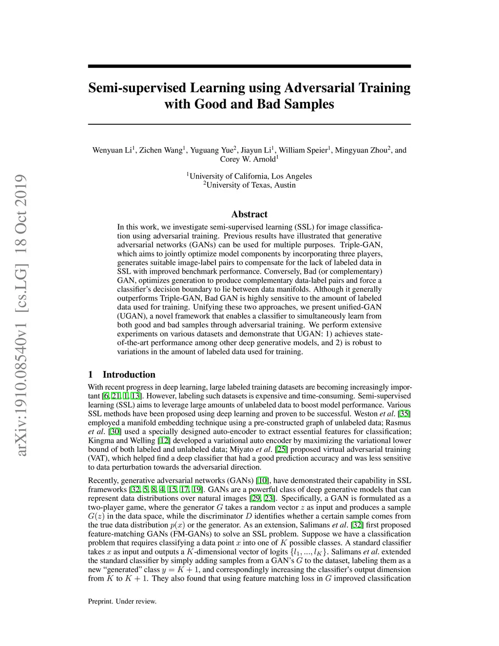 In this work, we investigate semi-supervised learning (SSL) for image classification using adversarial training. Previous results have illustrated that generative adversarial networks (GANs) can be used for multiple purposes. Triple-GAN, which aims to jointly optimize model components by incorporating three players, generates suitable image-label pairs to compensate for the lack of labeled data in SSL with improved benchmark performance. Conversely, Bad (or complementary) GAN, optimizes generation to produce complementary data-label pairs and force a classifier's decision boundary to lie between data manifolds. Although it generally outperforms Triple-GAN, Bad GAN is highly sensitive to the amount of labeled data used for training. Unifying these two approaches, we present unified-GAN (UGAN), a novel framework that enables a classifier to simultaneously learn from both good and bad samples through adversarial training. We perform extensive experiments on various datasets and demonstrate that UGAN: 1) achieves state-of-the-art performance among other deep generative models, and 2) is robust to variations in the amount of labeled data used for training.