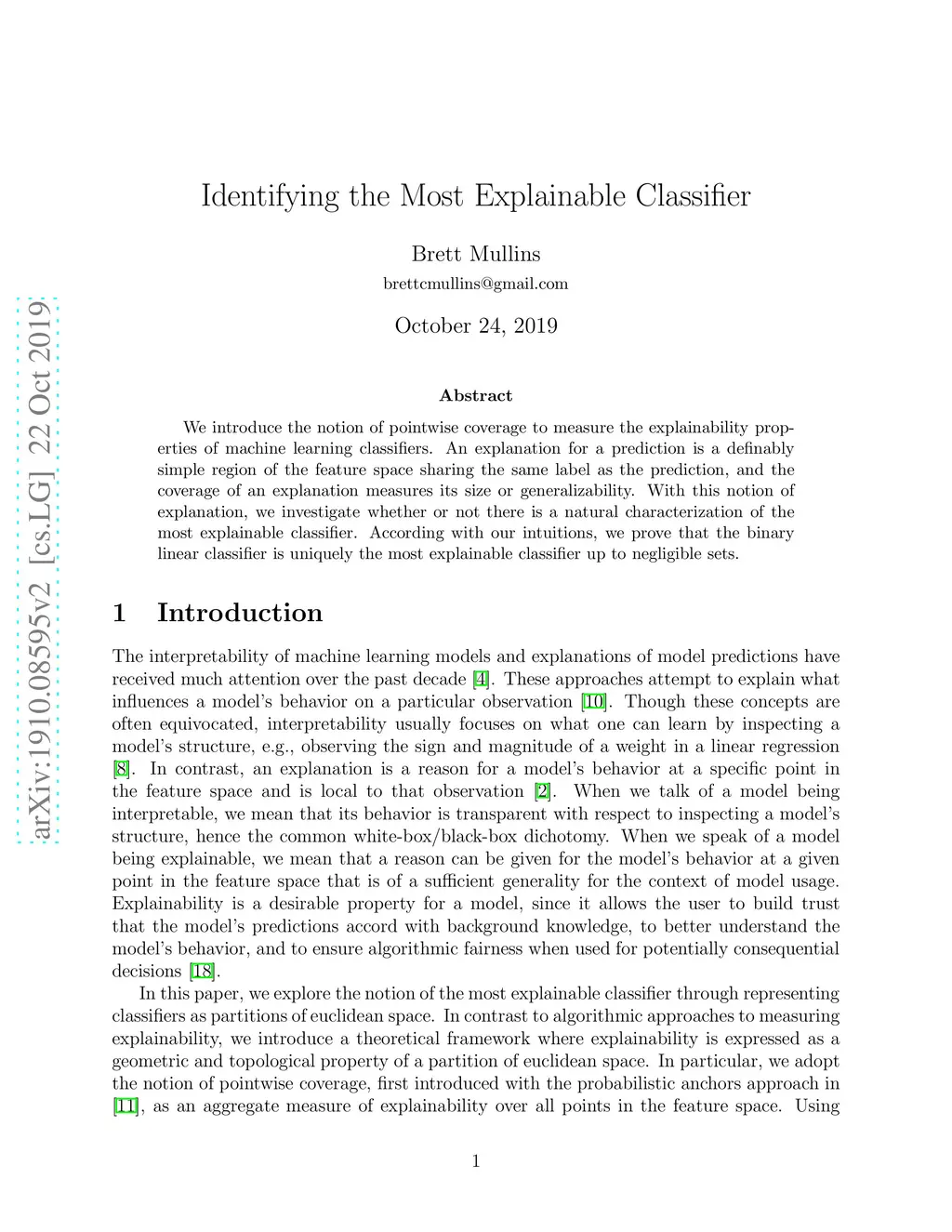 We introduce the notion of pointwise coverage to measure the explainability properties of machine learning classifiers. An explanation for a prediction is a definably simple region of the feature space sharing the same label as the prediction, and the coverage of an explanation measures its size or generalizability. With this notion of explanation, we investigate whether or not there is a natural characterization of the most explainable classifier. According with our intuitions, we prove that the binary linear classifier is uniquely the most explainable classifier up to negligible sets.