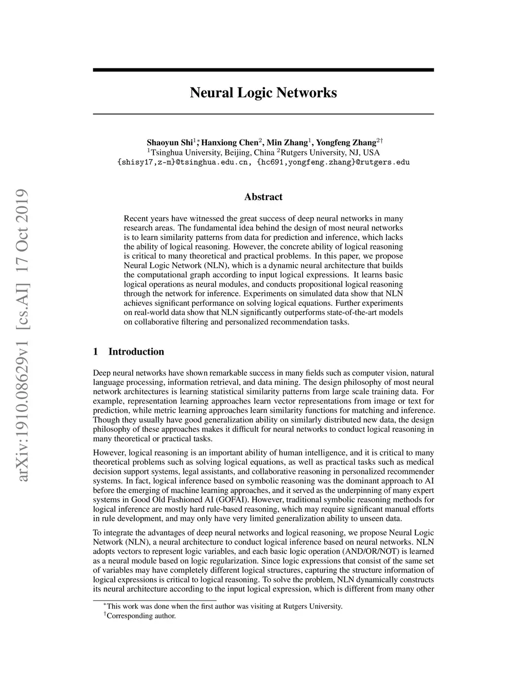 Recent years have witnessed the great success of deep neural networks in many research areas. The fundamental idea behind the design of most neural networks is to learn similarity patterns from data for prediction and inference, which lacks the ability of logical reasoning. However, the concrete ability of logical reasoning is critical to many theoretical and practical problems. In this paper, we propose Neural Logic Network (NLN), which is a dynamic neural architecture that builds the computational graph according to input logical expressions. It learns basic logical operations as neural modules, and conducts propositional logical reasoning through the network for inference. Experiments on simulated data show that NLN achieves significant performance on solving logical equations. Further experiments on real-world data show that NLN significantly outperforms state-of-the-art models on collaborative filtering and personalized recommendation tasks.