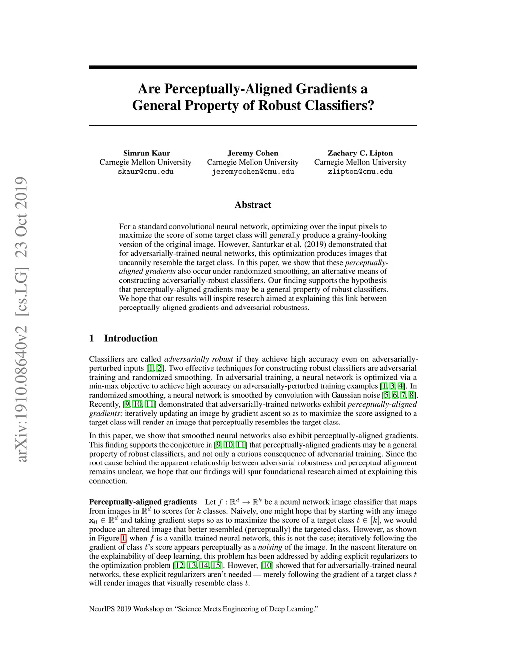 For a standard convolutional neural network, optimizing over the input pixels to maximize the score of some target class will generally produce a grainy-looking version of the original image. However, Santurkar et al. (2019) demonstrated that for adversarially-trained neural networks, this optimization produces images that uncannily resemble the target class. In this paper, we show that these "perceptually-aligned gradients" also occur under randomized smoothing, an alternative means of constructing adversarially-robust classifiers. Our finding supports the hypothesis that perceptually-aligned gradients may be a general property of robust classifiers. We hope that our results will inspire research aimed at explaining this link between perceptually-aligned gradients and adversarial robustness.