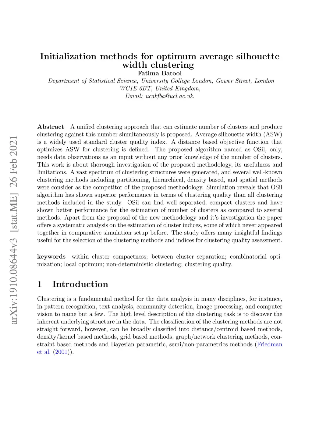 Initialization methods for optimum average silhouette width clustering