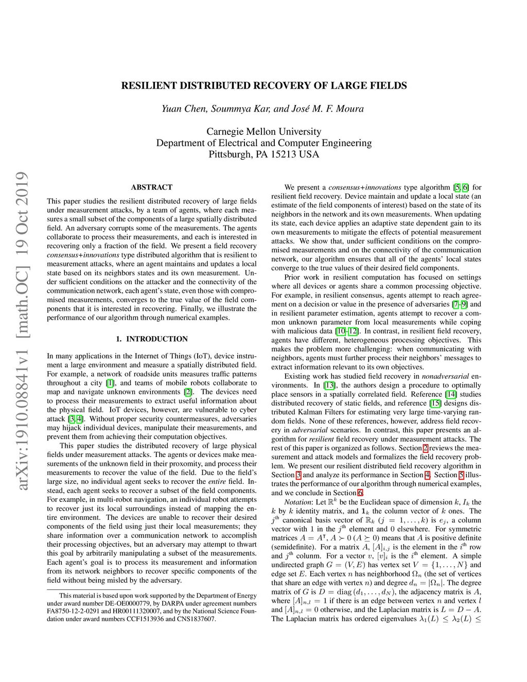 This paper studies the resilient distributed recovery of large fields under measurement attacks, by a team of agents, where each measures a small subset of the components of a large spatially distributed field. An adversary corrupts some of the measurements. The agents collaborate to process their measurements, and each is interested in recovering only a fraction of the field. We present a field recovery consensus+innovations type distributed algorithm that is resilient to measurement attacks, where an agent maintains and updates a local state based on its neighbors states and its own measurement. Under sufficient conditions on the attacker and the connectivity of the communication network, each agent's state, even those with compromised measurements, converges to the true value of the field components that it is interested in recovering. Finally, we illustrate the performance of our algorithm through numerical examples.