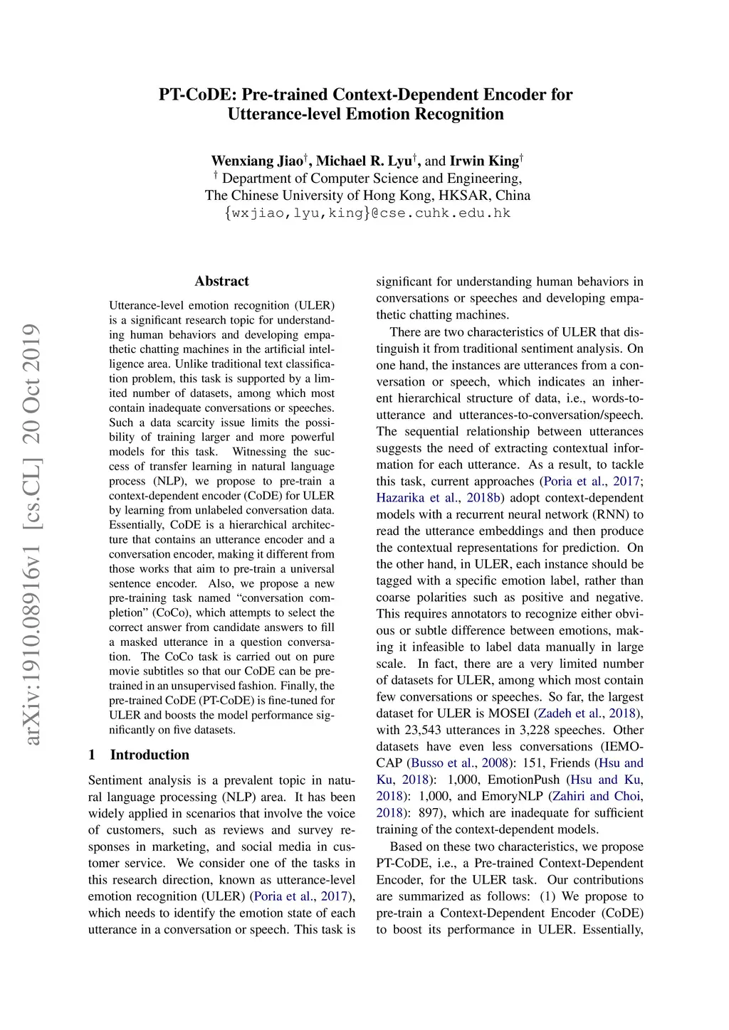 Utterance-level emotion recognition (ULER) is a significant research topic for understanding human behaviors and developing empathetic chatting machines in the artificial intelligence area. Unlike traditional text classification problem, this task is supported by a limited number of datasets, among which most contain inadequate conversations or speeches. Such a data scarcity issue limits the possibility of training larger and more powerful models for this task. Witnessing the success of transfer learning in natural language process (NLP), we propose to pre-train a context-dependent encoder (CoDE) for ULER by learning from unlabeled conversation data. Essentially, CoDE is a hierarchical architecture that contains an utterance encoder and a conversation encoder, making it different from those works that aim to pre-train a universal sentence encoder. Also, we propose a new pre-training task named "conversation completion" (CoCo), which attempts to select the correct answer from candidate answers to fill a masked utterance in a question conversation. The CoCo task is carried out on pure movie subtitles so that our CoDE can be pre-trained in an unsupervised fashion. Finally, the pre-trained CoDE (PT-CoDE) is fine-tuned for ULER and boosts the model performance significantly on five datasets.