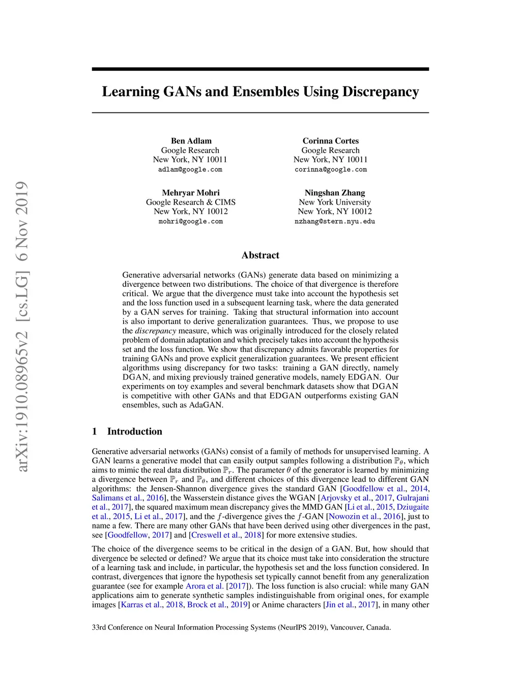 Generative adversarial networks (GANs) generate data based on minimizing a divergence between two distributions. The choice of that divergence is therefore critical. We argue that the divergence must take into account the hypothesis set and the loss function used in a subsequent learning task, where the data generated by a GAN serves for training. Taking that structural information into account is also important to derive generalization guarantees. Thus, we propose to use the discrepancy measure, which was originally introduced for the closely related problem of domain adaptation and which precisely takes into account the hypothesis set and the loss function. We show that discrepancy admits favorable properties for training GANs and prove explicit generalization guarantees. We present efficient algorithms using discrepancy for two tasks: training a GAN directly, namely DGAN, and mixing previously trained generative models, namely EDGAN. Our experiments on toy examples and several benchmark datasets show that DGAN is competitive with other GANs and that EDGAN outperforms existing GAN ensembles, such as AdaGAN.