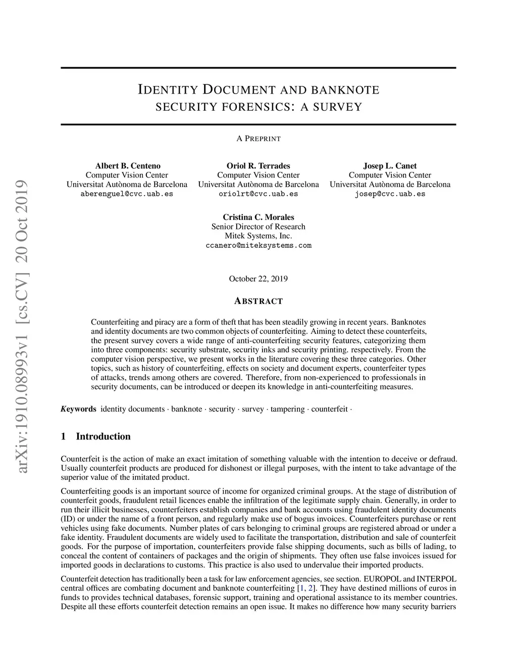 Counterfeiting and piracy are a form of theft that has been steadily growing in recent years. Banknotes and identity documents are two common objects of counterfeiting. Aiming to detect these counterfeits, the present survey covers a wide range of anti-counterfeiting security features, categorizing them into three components: security substrate, security inks and security printing. respectively. From the computer vision perspective, we present works in the literature covering these three categories. Other topics, such as history of counterfeiting, effects on society and document experts, counterfeiter types of attacks, trends among others are covered. Therefore, from non-experienced to professionals in security documents, can be introduced or deepen its knowledge in anti-counterfeiting measures.